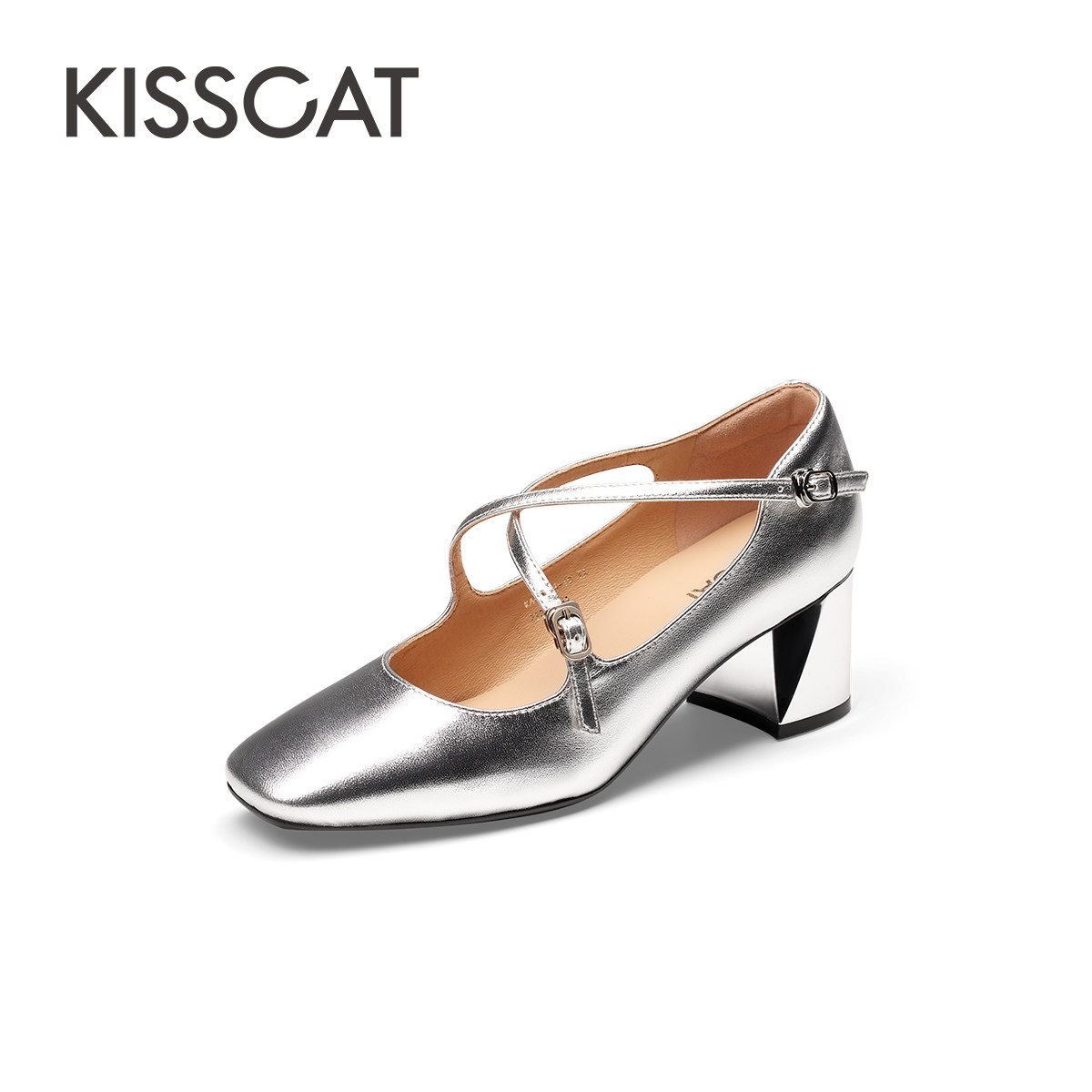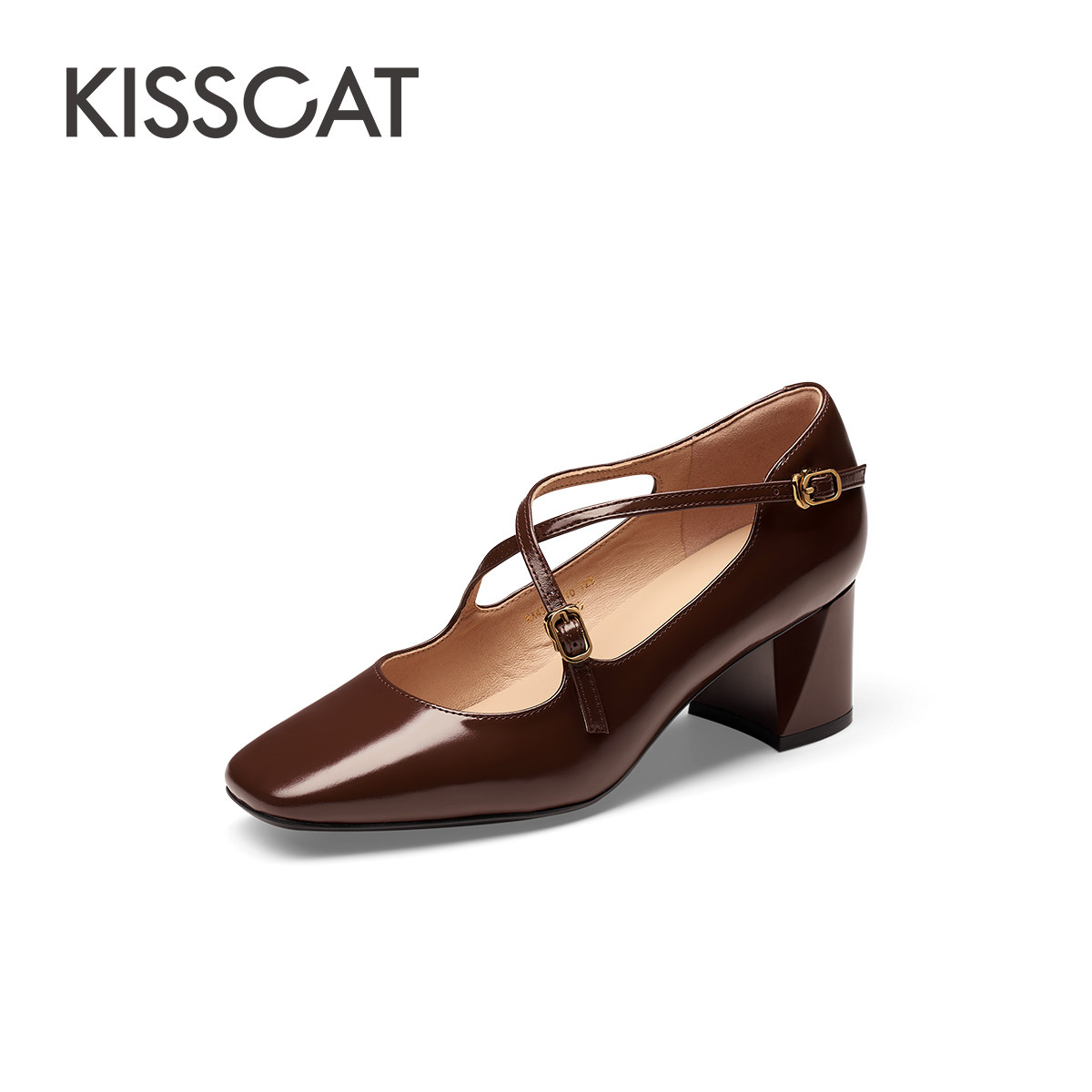 KISS CAT/接吻猫春秋牛皮玛丽珍鞋交叉扣带粗跟单鞋女KA43614-10