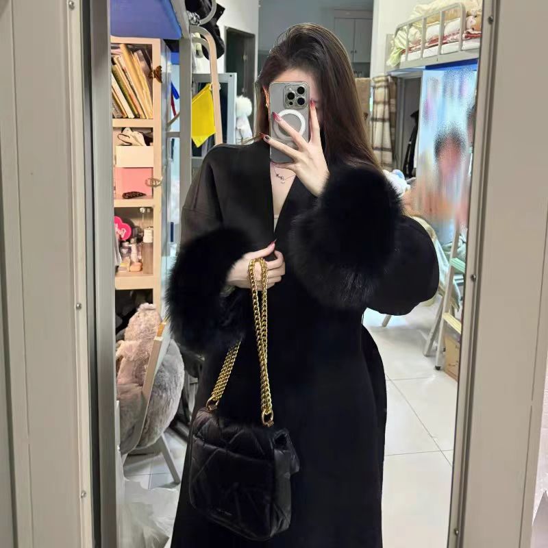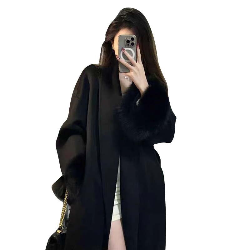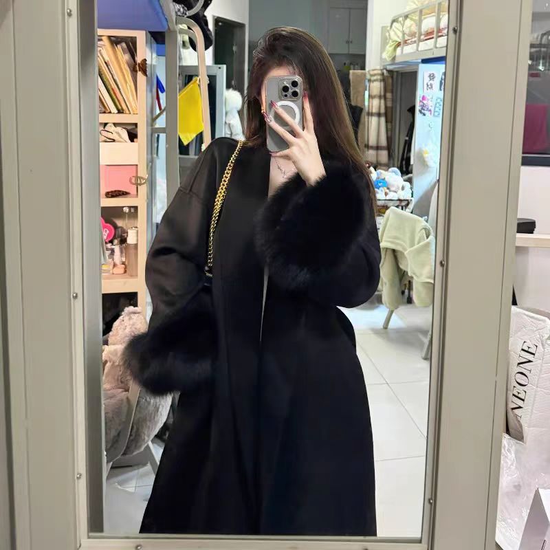 赫本风高级感双面呢子黑色大衣女秋季独特中长款收腰气质毛呢外套