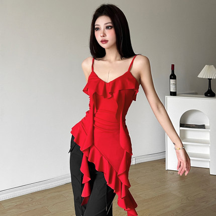 怪诞女孩 性感辣妹风短款木耳边拼接连衣裙不规则收腰显瘦吊带裙