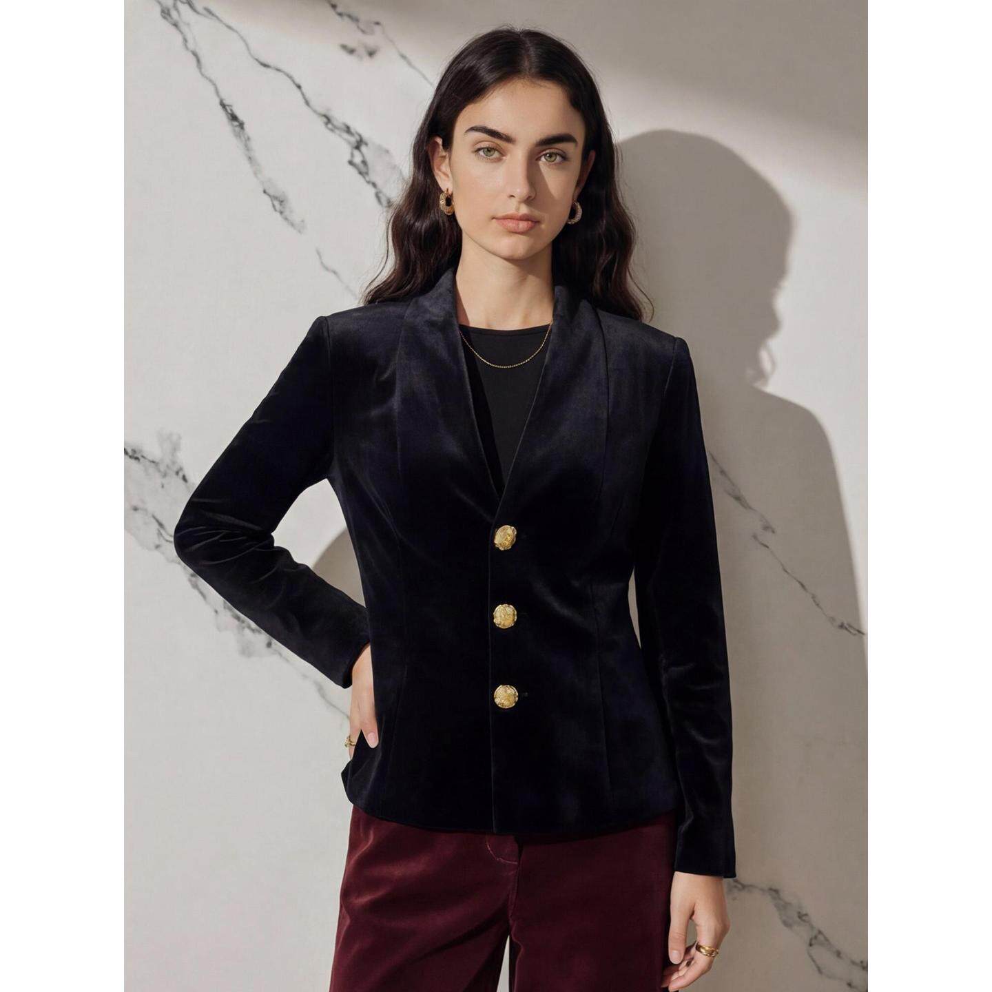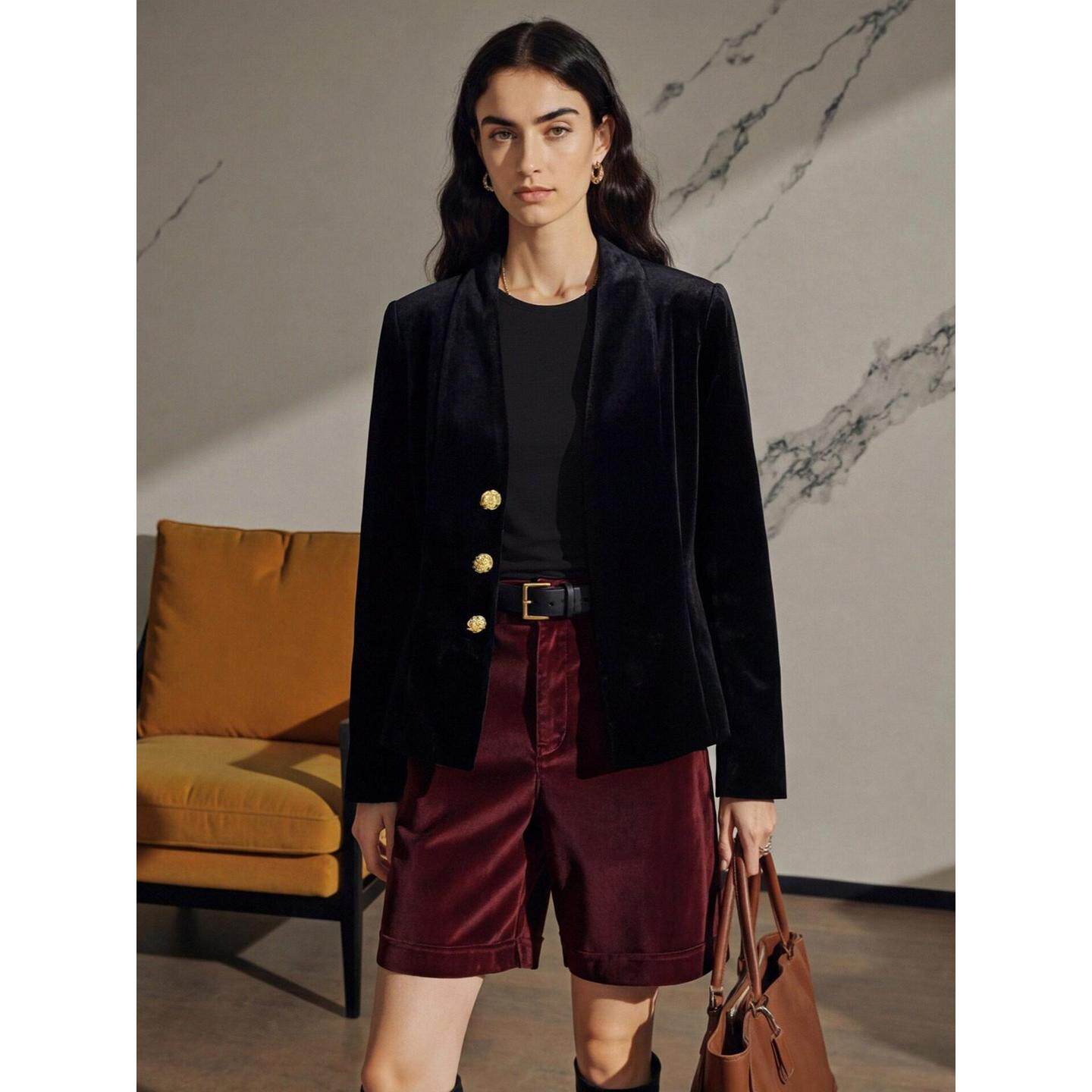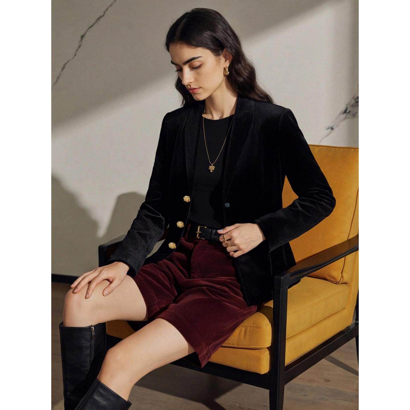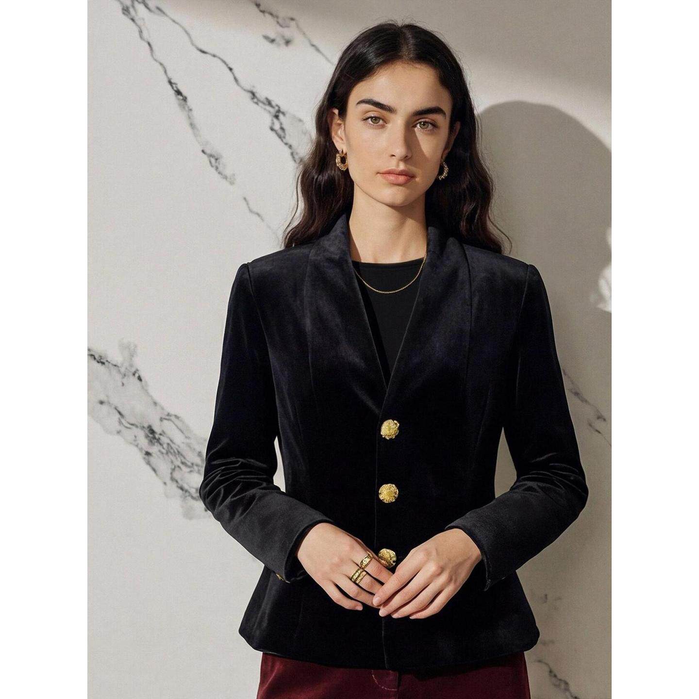 Basic House/百家好黑色金丝绒西装外套女2026春季新款V领小西服