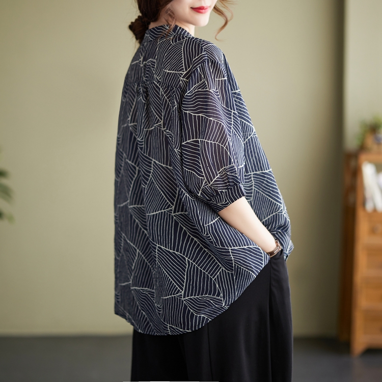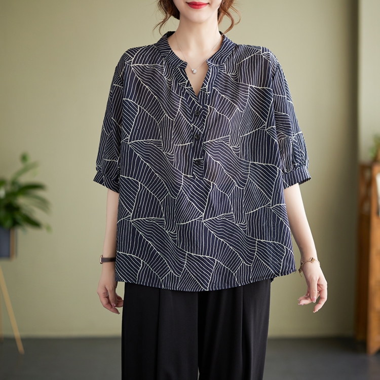 复古显瘦V领短袖衬衫不规则条纹拼接宽松上衣女 宽松版小V领T恤衫