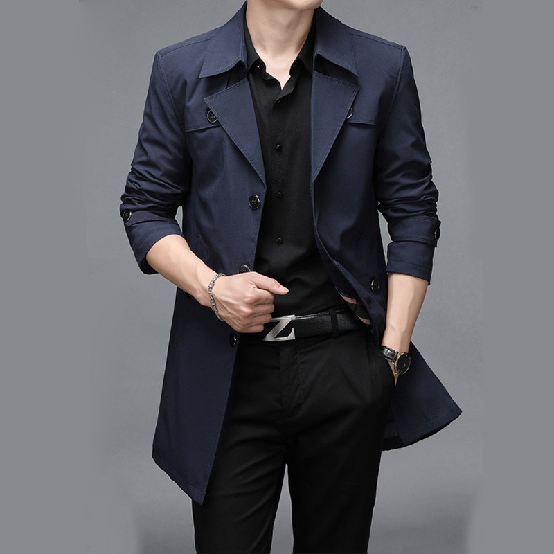 春秋季男士翻领商务休闲中长款风衣外套修身潮流加厚大衣大码黑色