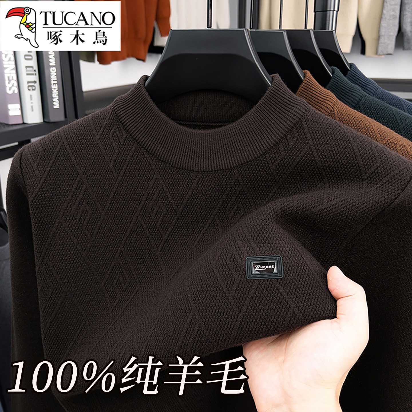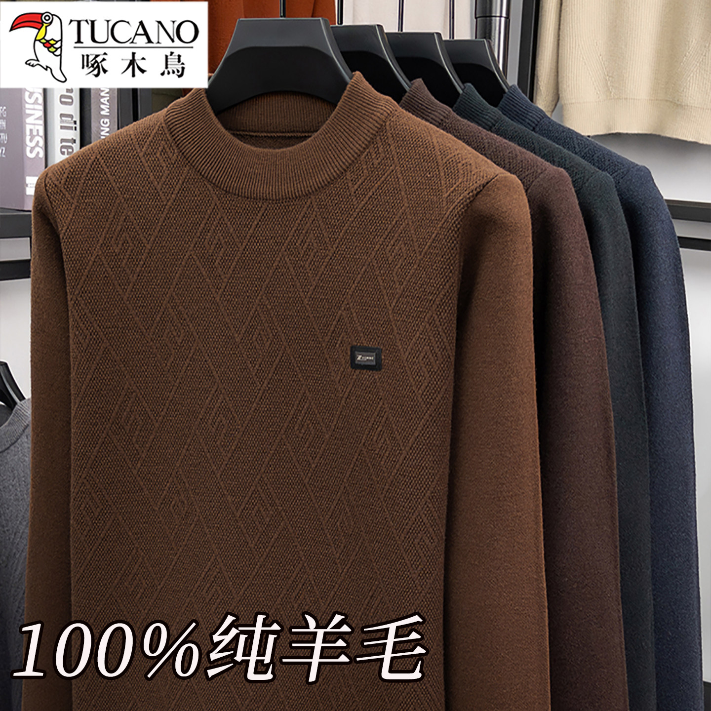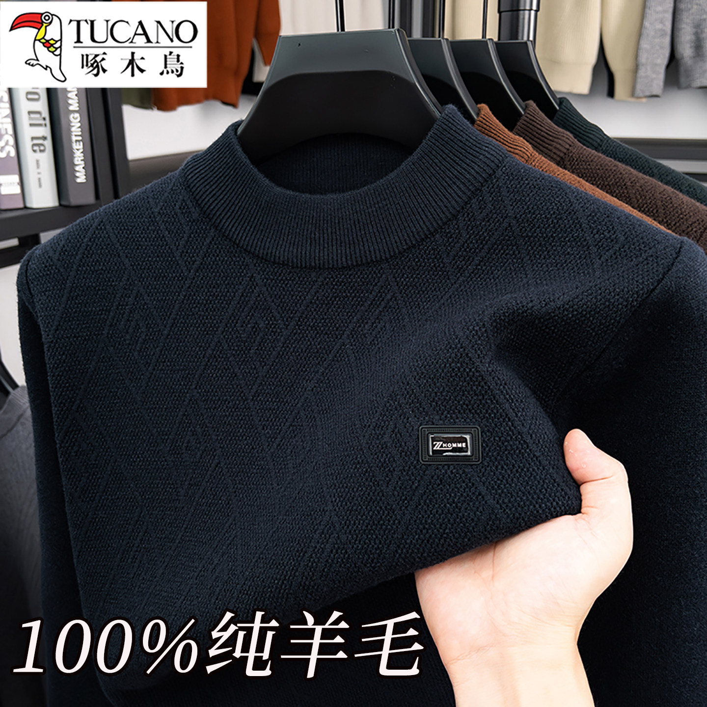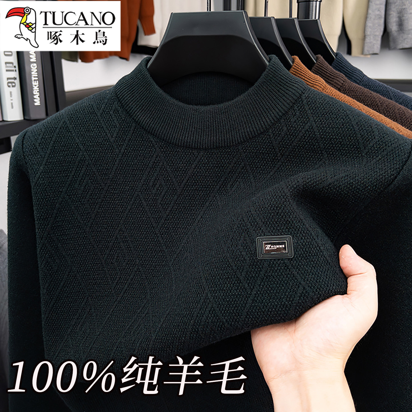 啄木鸟100%纯羊毛衫男士针织打底衫秋冬加厚半高领提花保暖羊毛衫