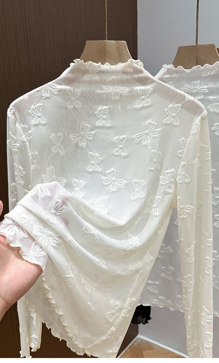 木耳边半高领网纱打底衫女秋冬新款内搭纱衣柔软洋气提花蕾丝上衣
