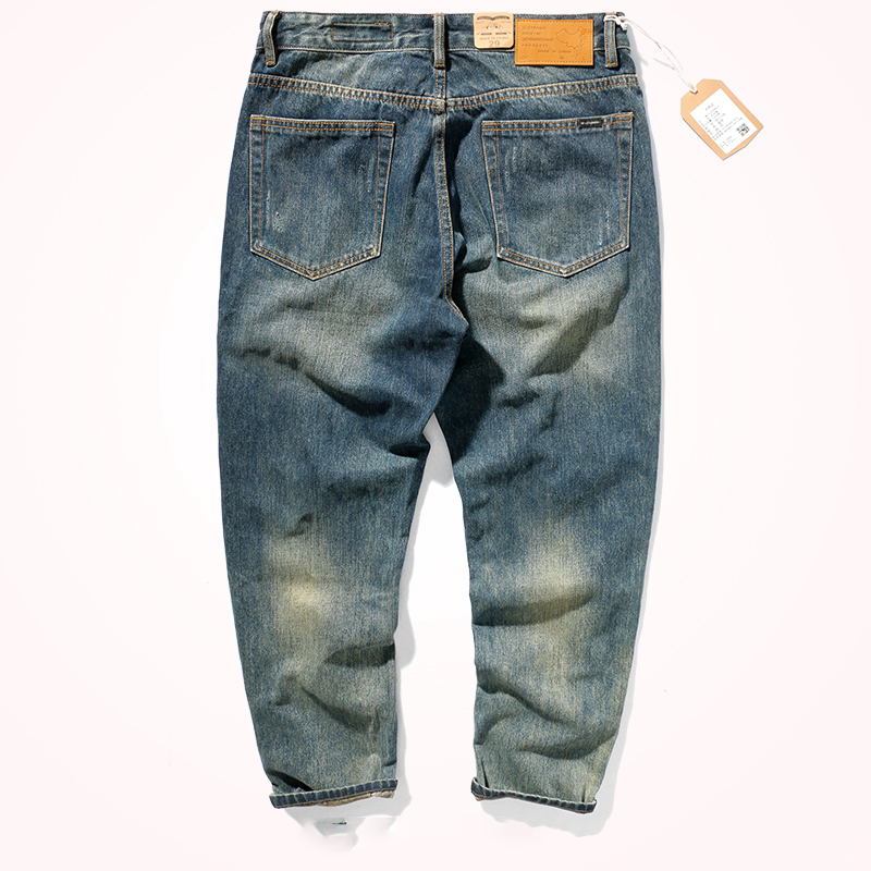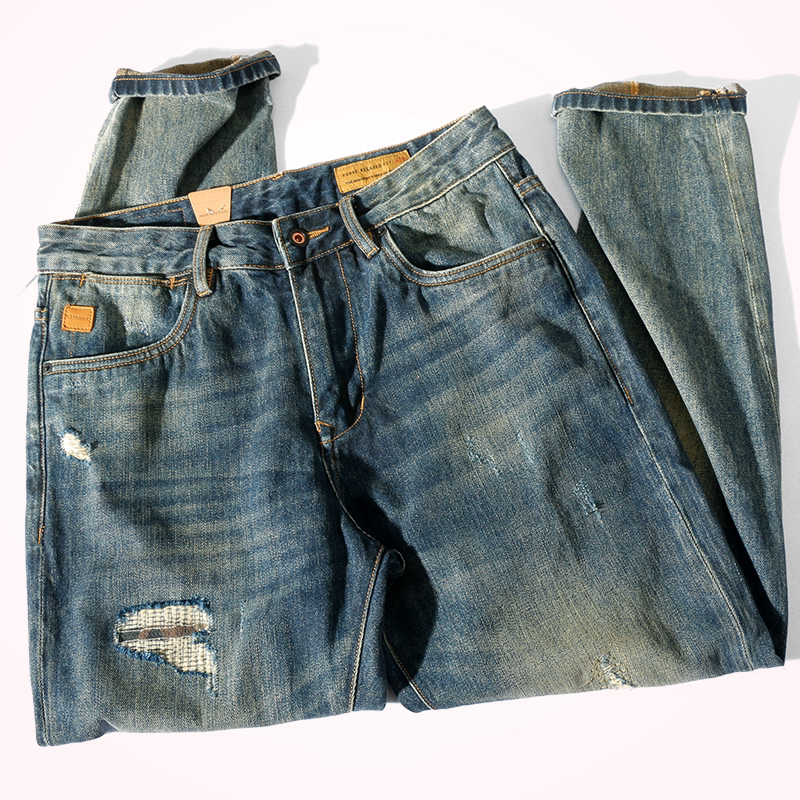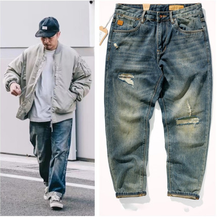 美式潮牌余文乐同款牛仔裤男水洗做旧设计感复古潮流休闲宽松长裤