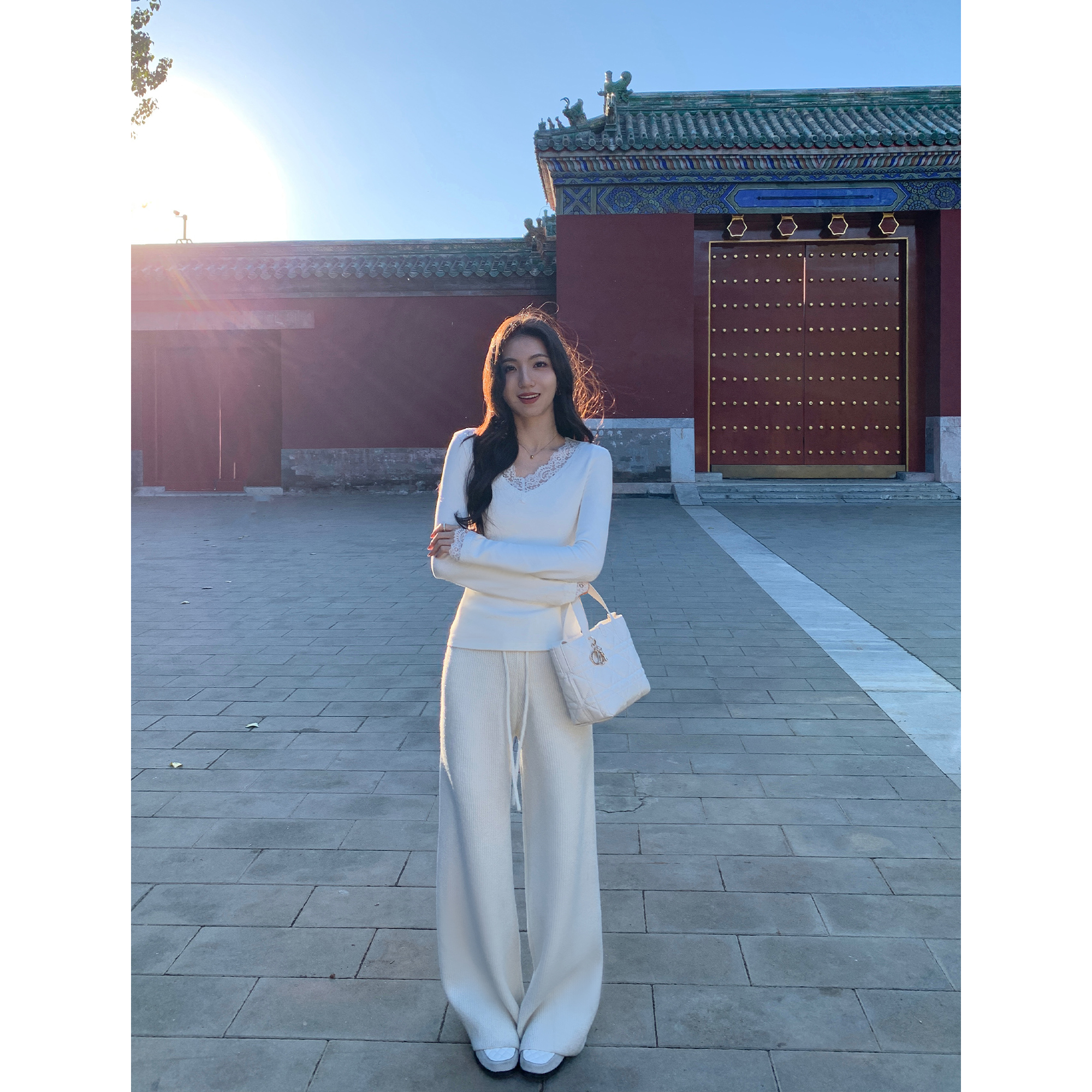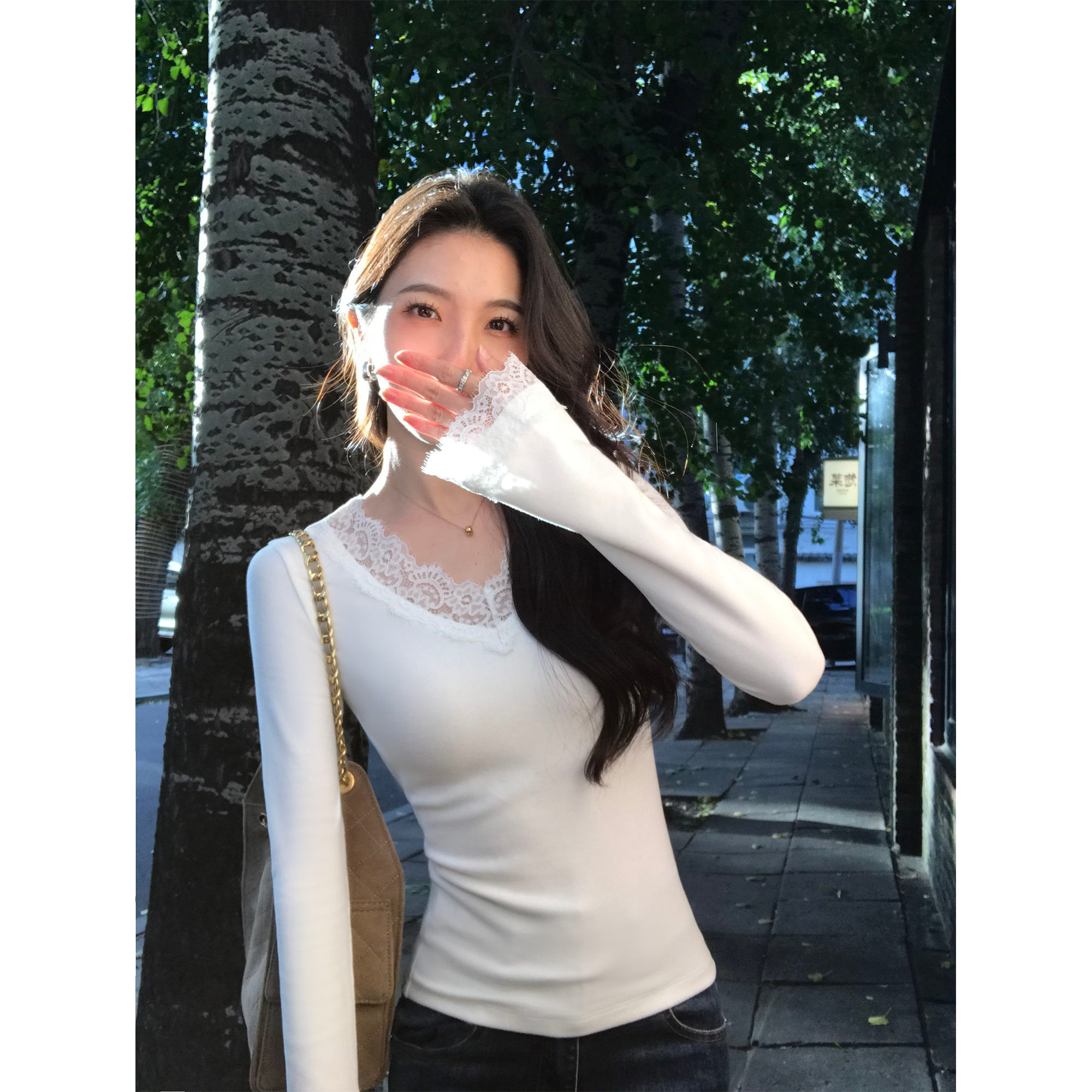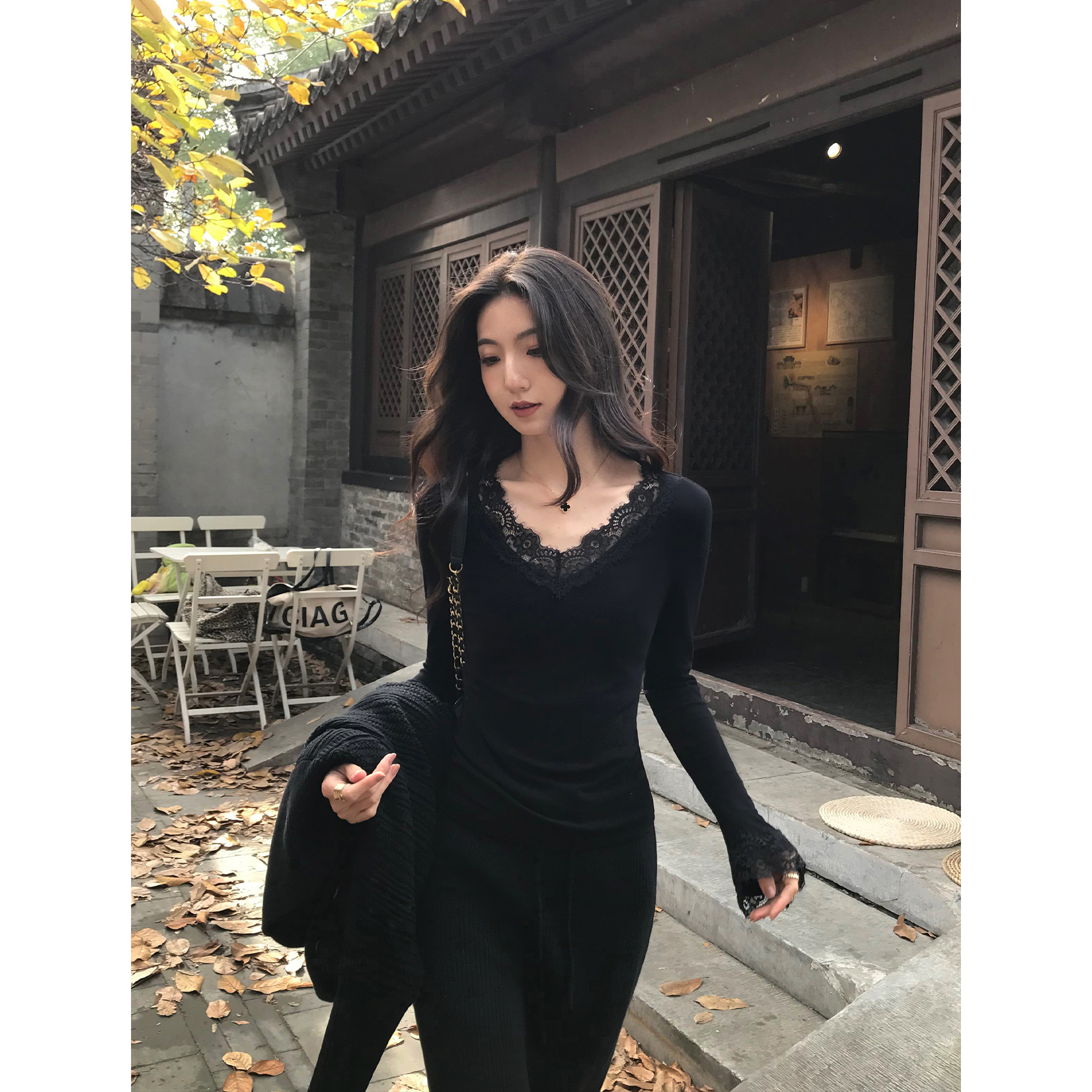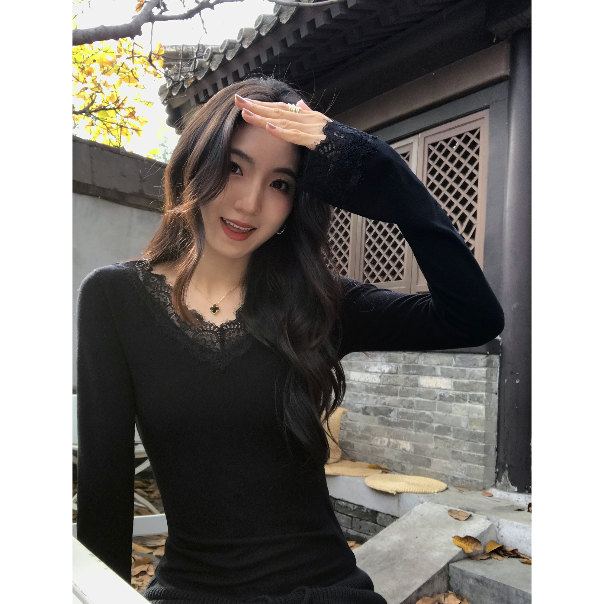 MULVAN 心动降临 蕾丝花边V领针织衫女高级感修身长袖打底上衣