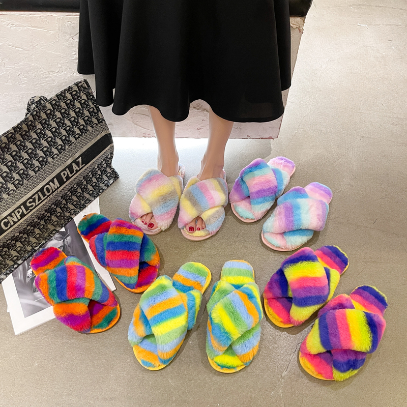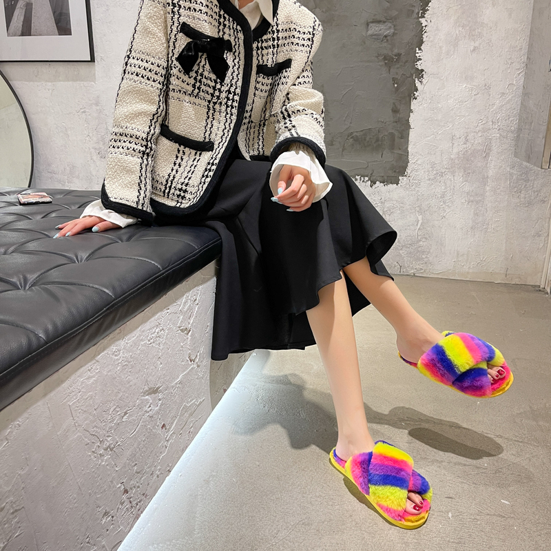 彩虹毛毛拖鞋女外穿2025年秋冬新款可爱时尚百搭平底一字毛拖