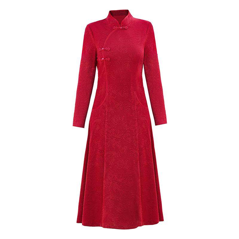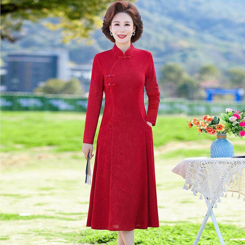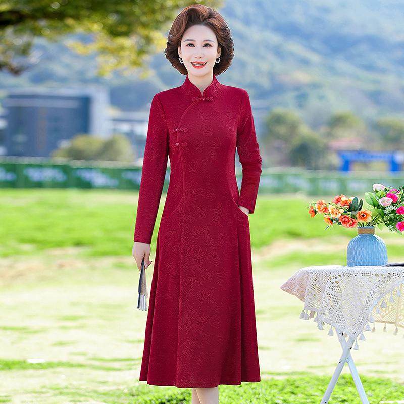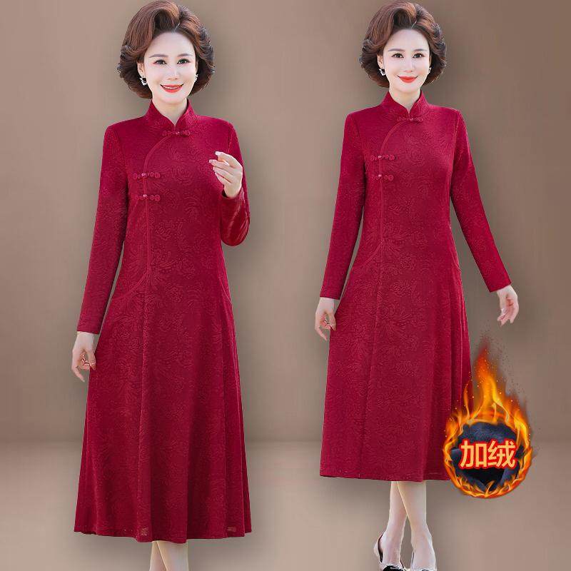 新款高端喜婆婆婚宴装旗袍连衣裙中年妈妈秋冬季加绒加厚遮肚礼服