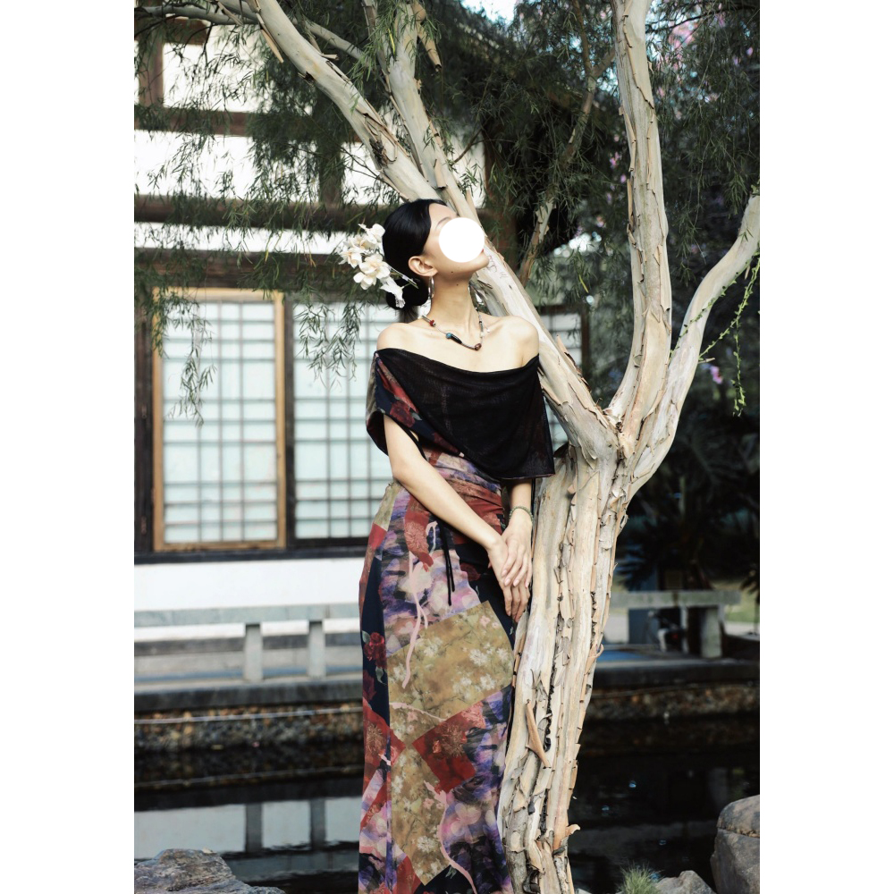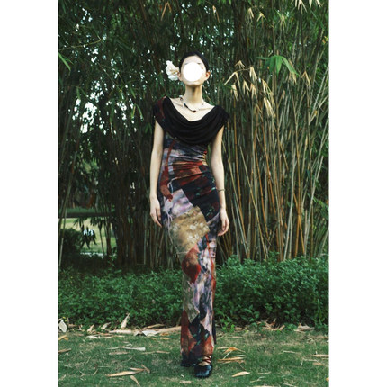 法式小众轻熟名媛风微胖大码网纱拼接包臀鱼尾连衣裙新款印花长裙