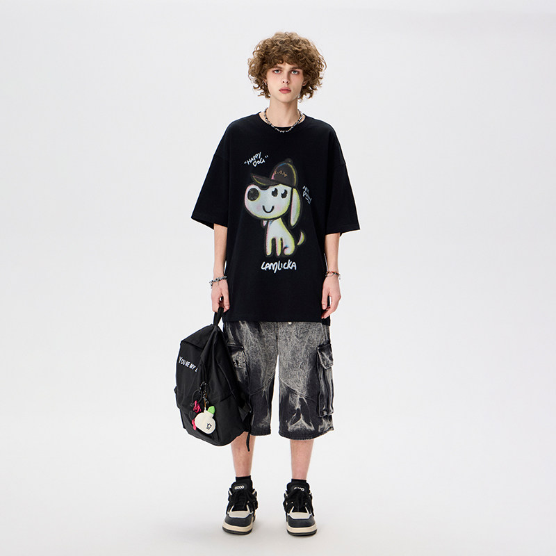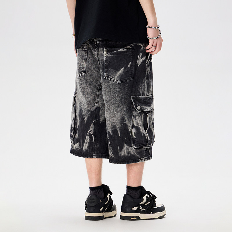 LAMLICKA渐变扎染黑色牛仔短裤男夏季宽松工装阔腿美式复古七分裤