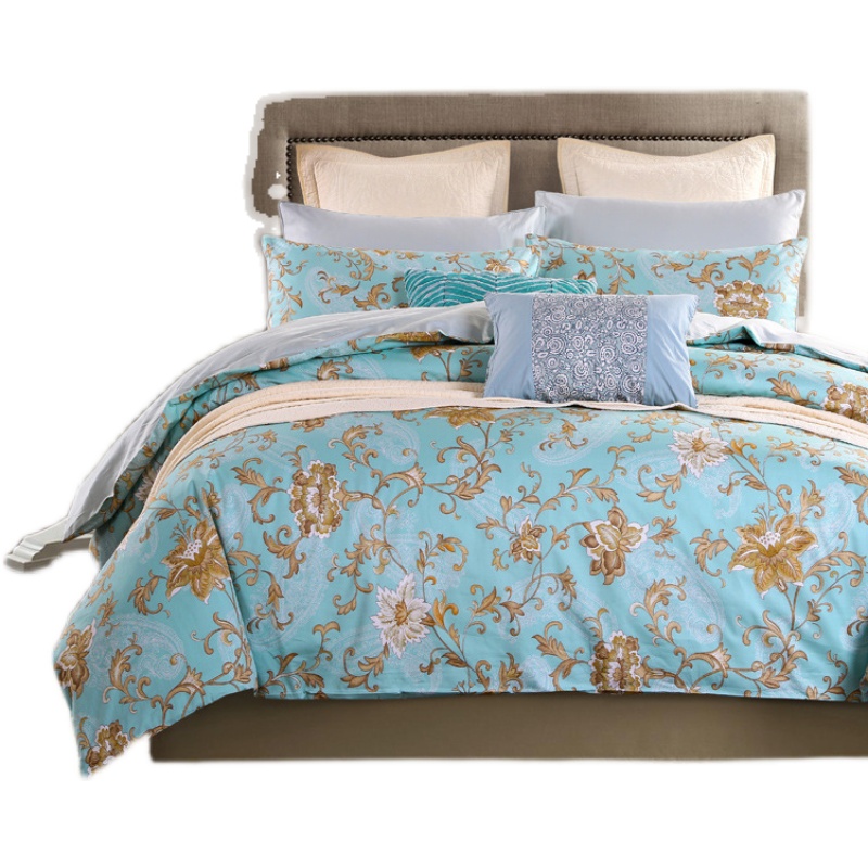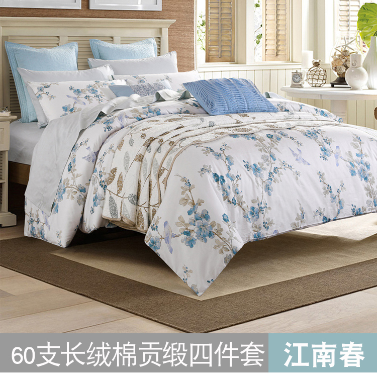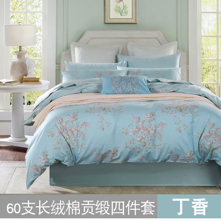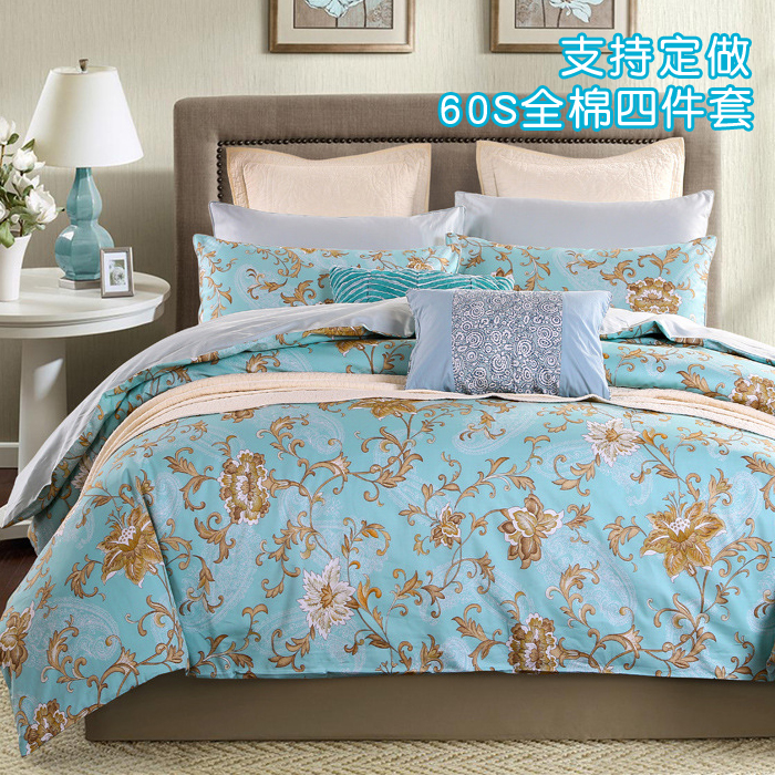 出口美式田园60支长绒棉贡缎被套203x229x230纯棉床笠四件套定做