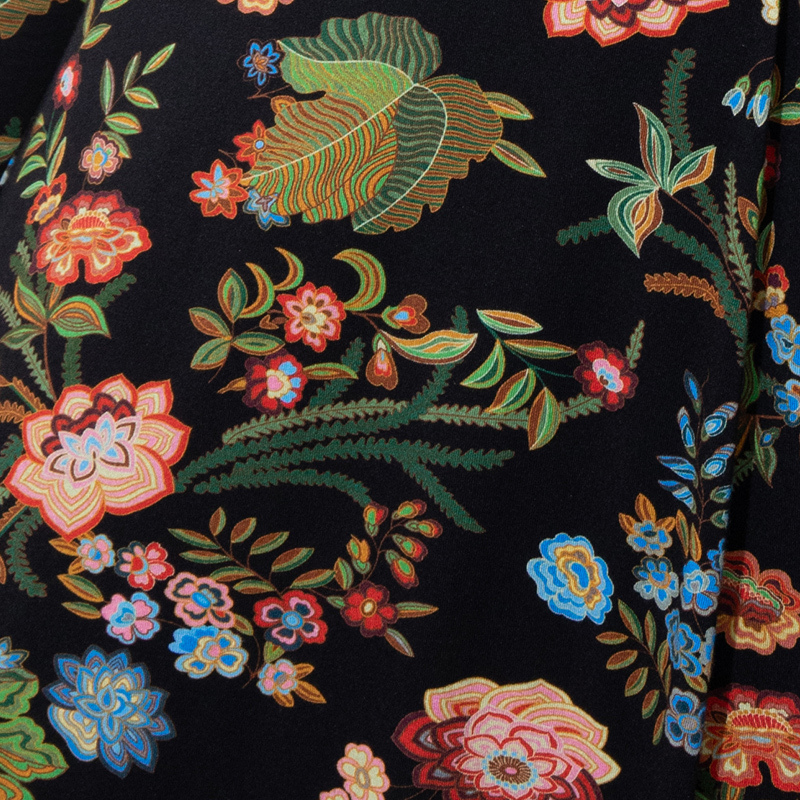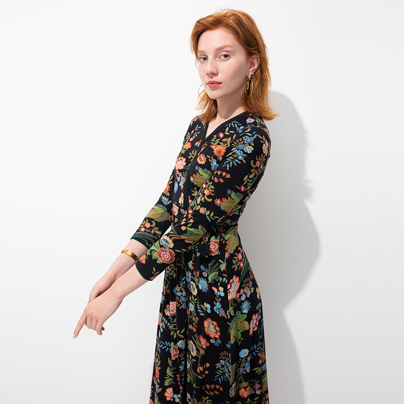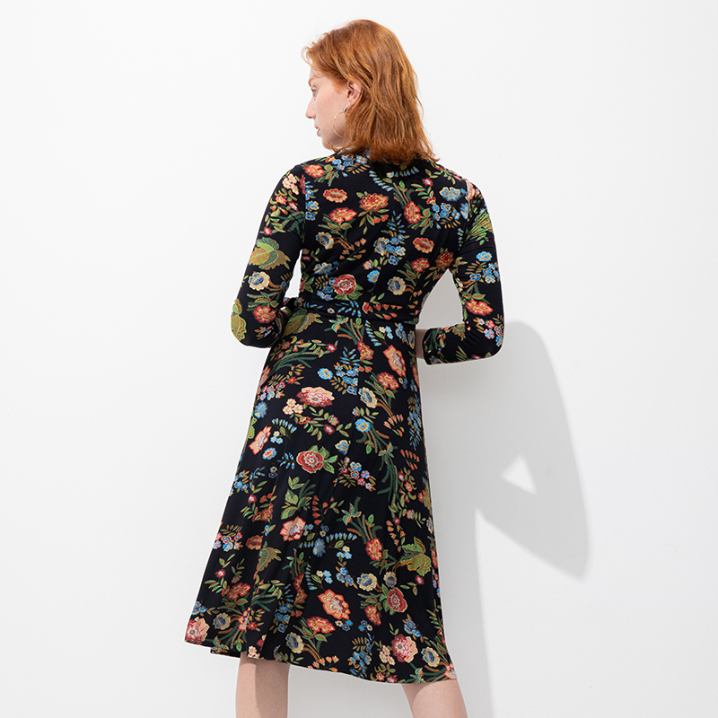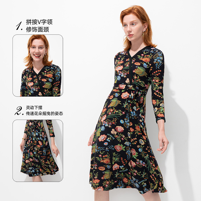 MORELINE商场同款印花连衣裙冬装新款复古国风小V领修身中长裙