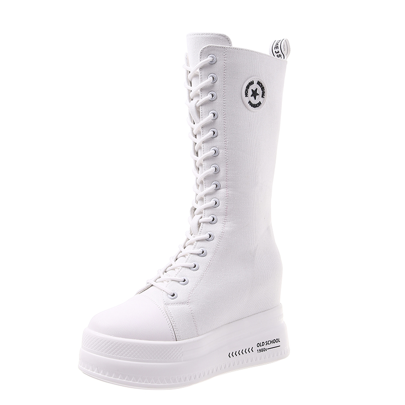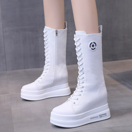秋季高帮帆布鞋女系带高筒短靴拉链长筒透气内增高大码休闲小白鞋