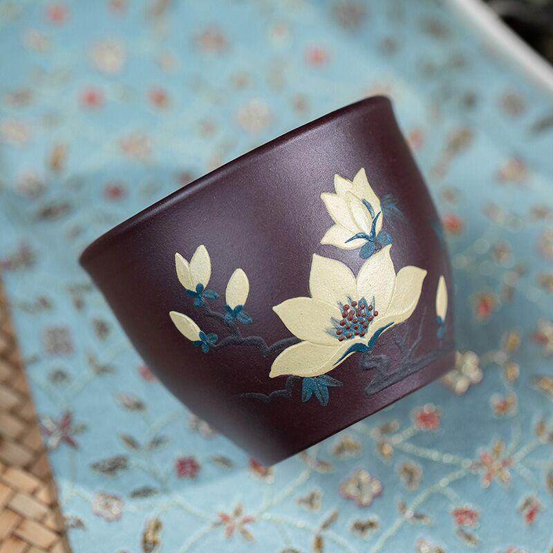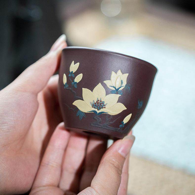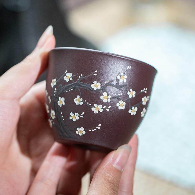 宜兴原矿紫砂老紫泥手工绘梅花玉兰主人杯办公室喝茶品茗茶杯口杯