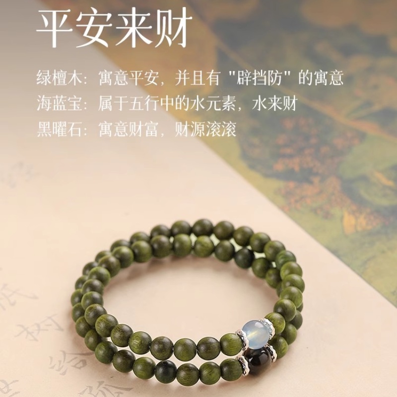天然绿檀木文玩双圈手串海蓝宝转运珠男女款木质佛念珠手链送礼物