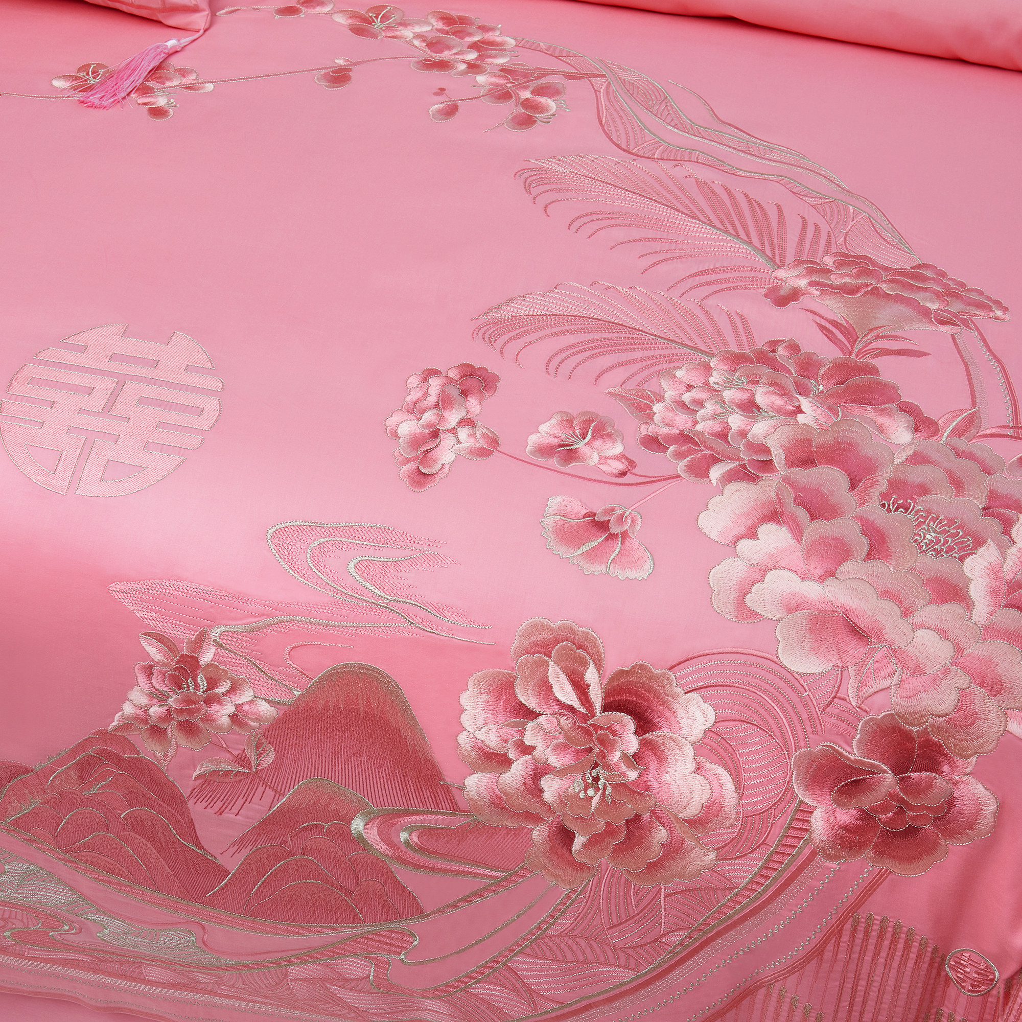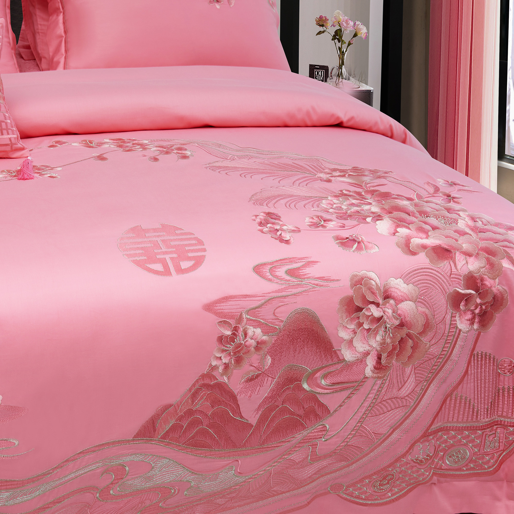 140支全棉粉色刺绣婚庆四六件套
