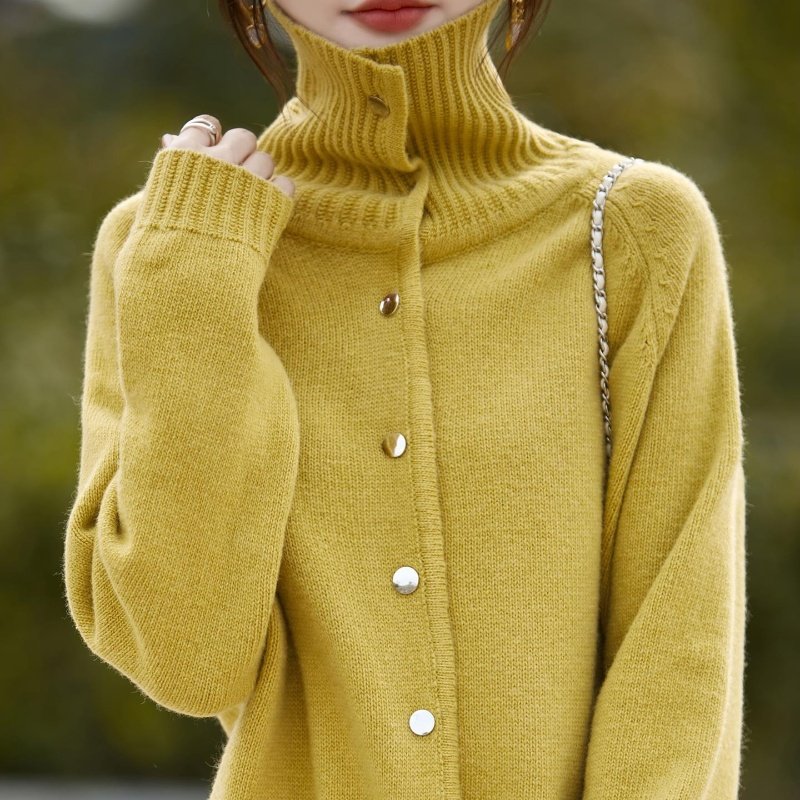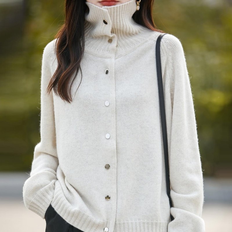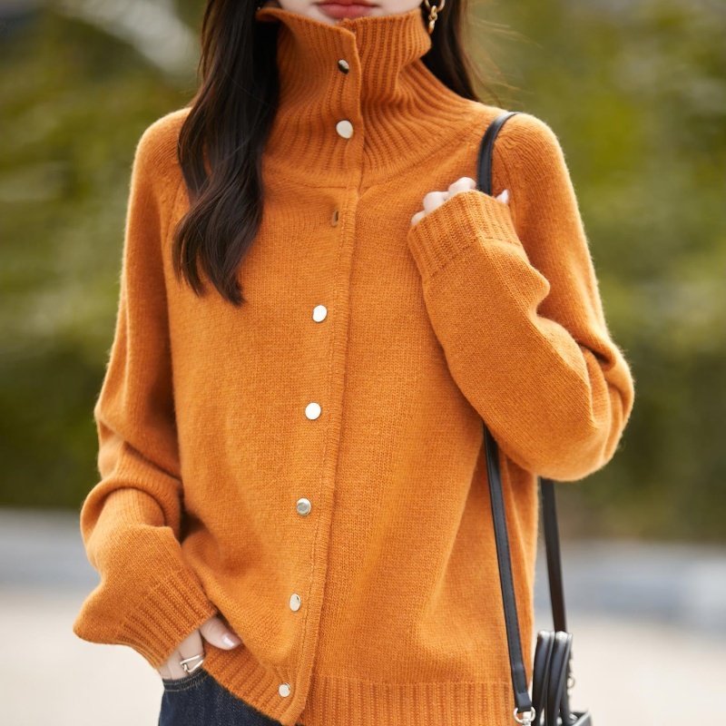 覆古洋气高领纽扣灰色针织开衫女纽扣毛衣外套慵懒风洋气上衣毛衫
