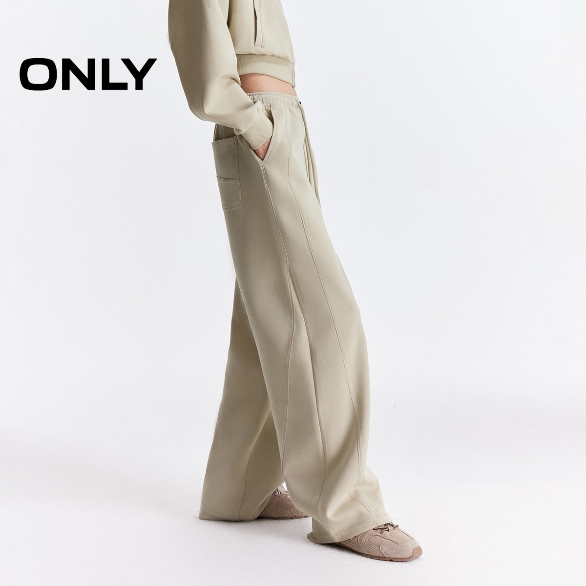 ONLY2025冬季新款宽松舒适自在弹力抽绳腰头弯刀长裤休闲裤女