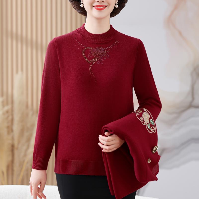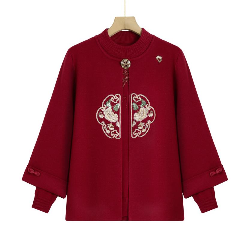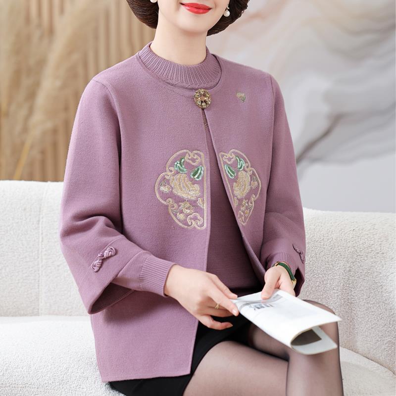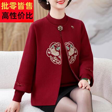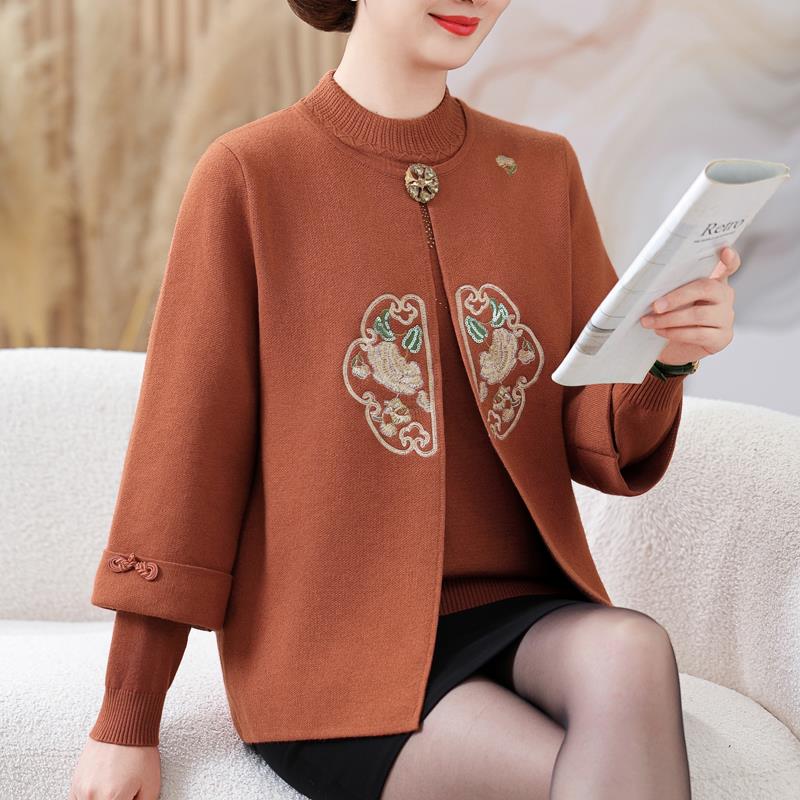 洋气高贵中老年妈妈秋冬加肥加大码女装新中式针织外套两件套开衫
