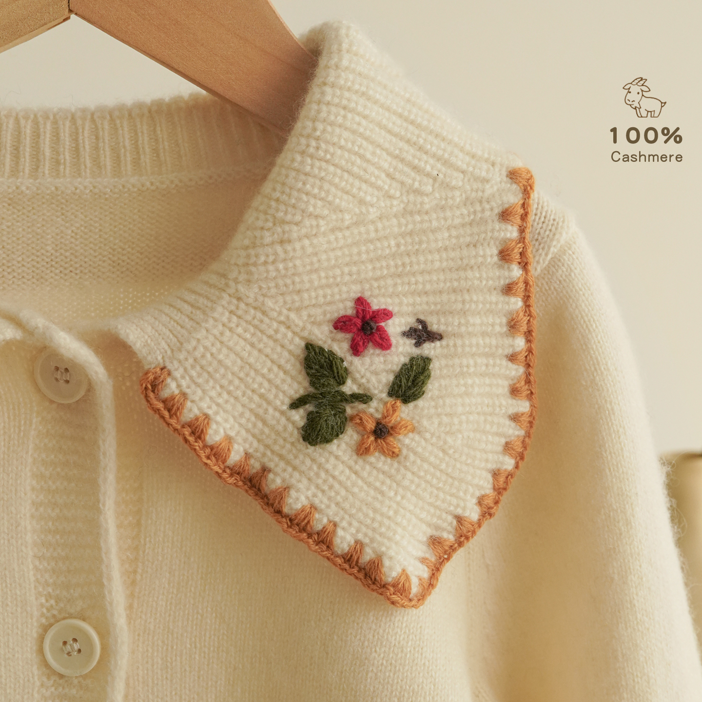 康赛妮100%儿童纯羊绒女童毛衣宝宝针织开衫大翻领手工绣花秋冬款