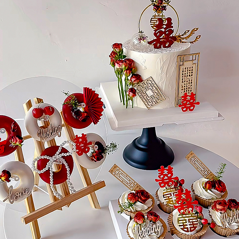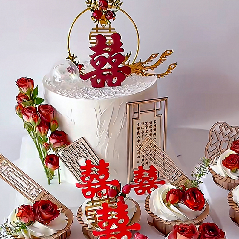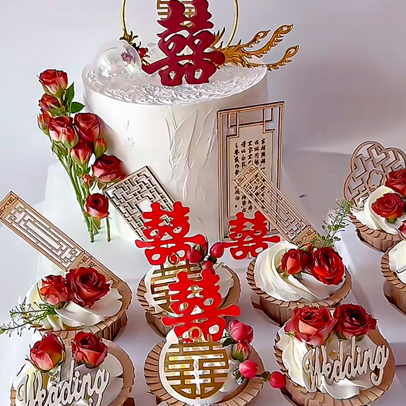 新中式订婚结婚纸杯蛋糕装饰红色喜字玫瑰屏风凤凰于飞甜甜圈插件