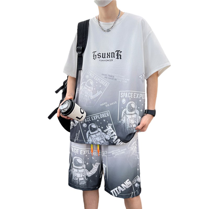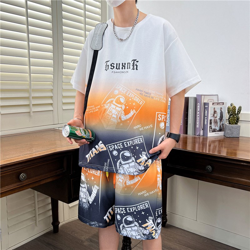 胖子夏季渐变短袖休闲运动套装男士宽松加肥加大码五分短裤套装潮