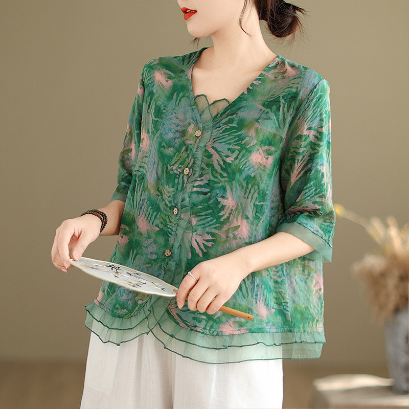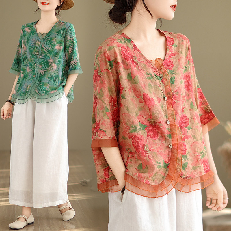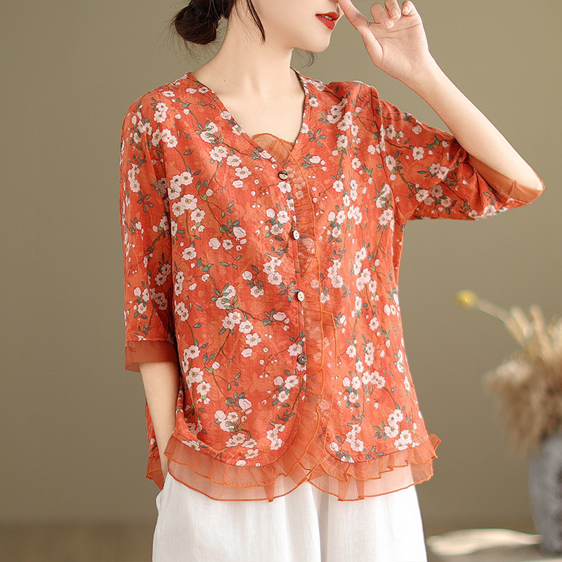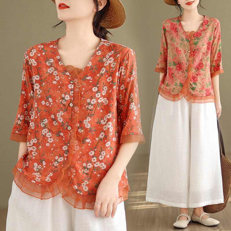 荷叶边碎花棉麻衬衫女短袖春夏2025新款复古洋气妈妈宽松遮肚上衣
