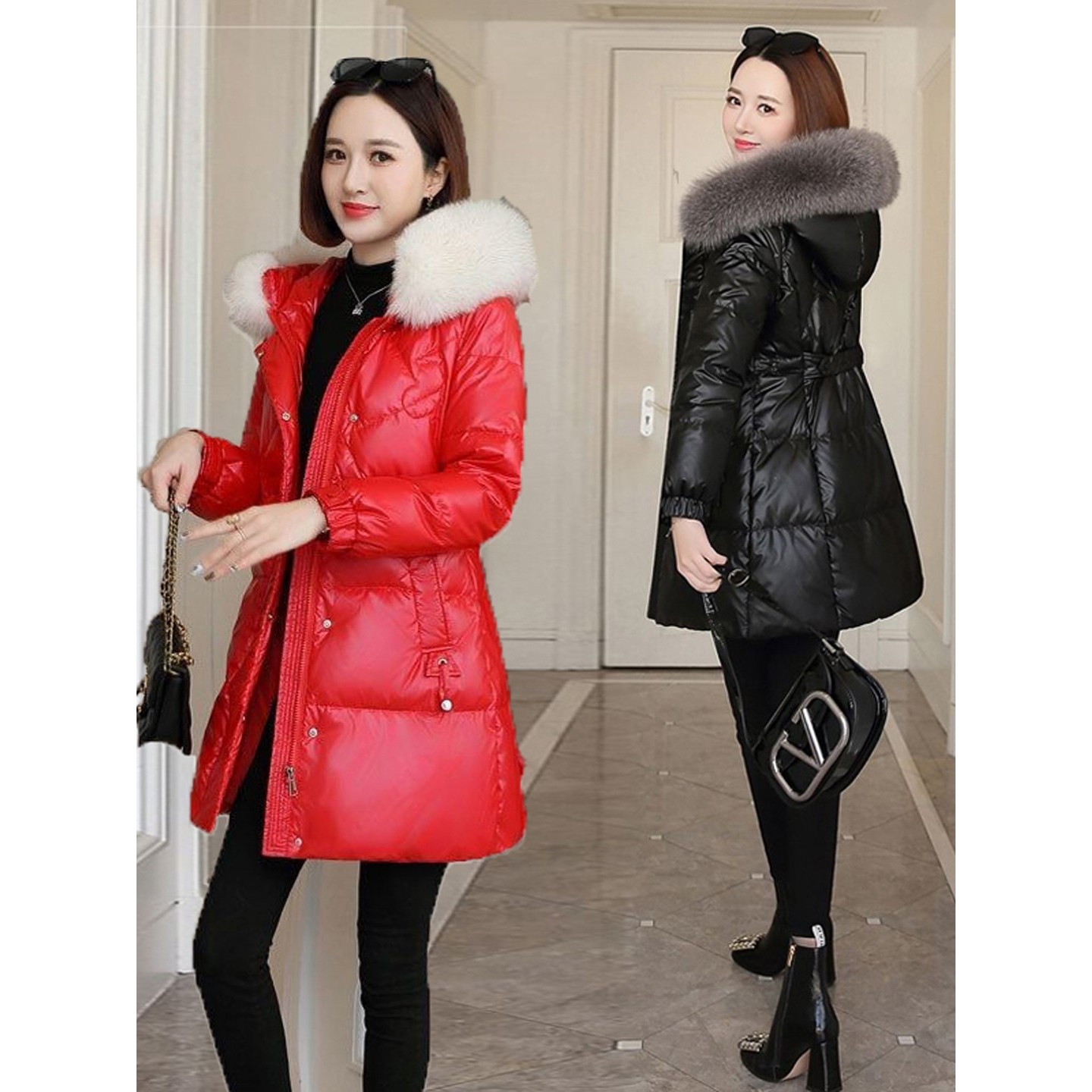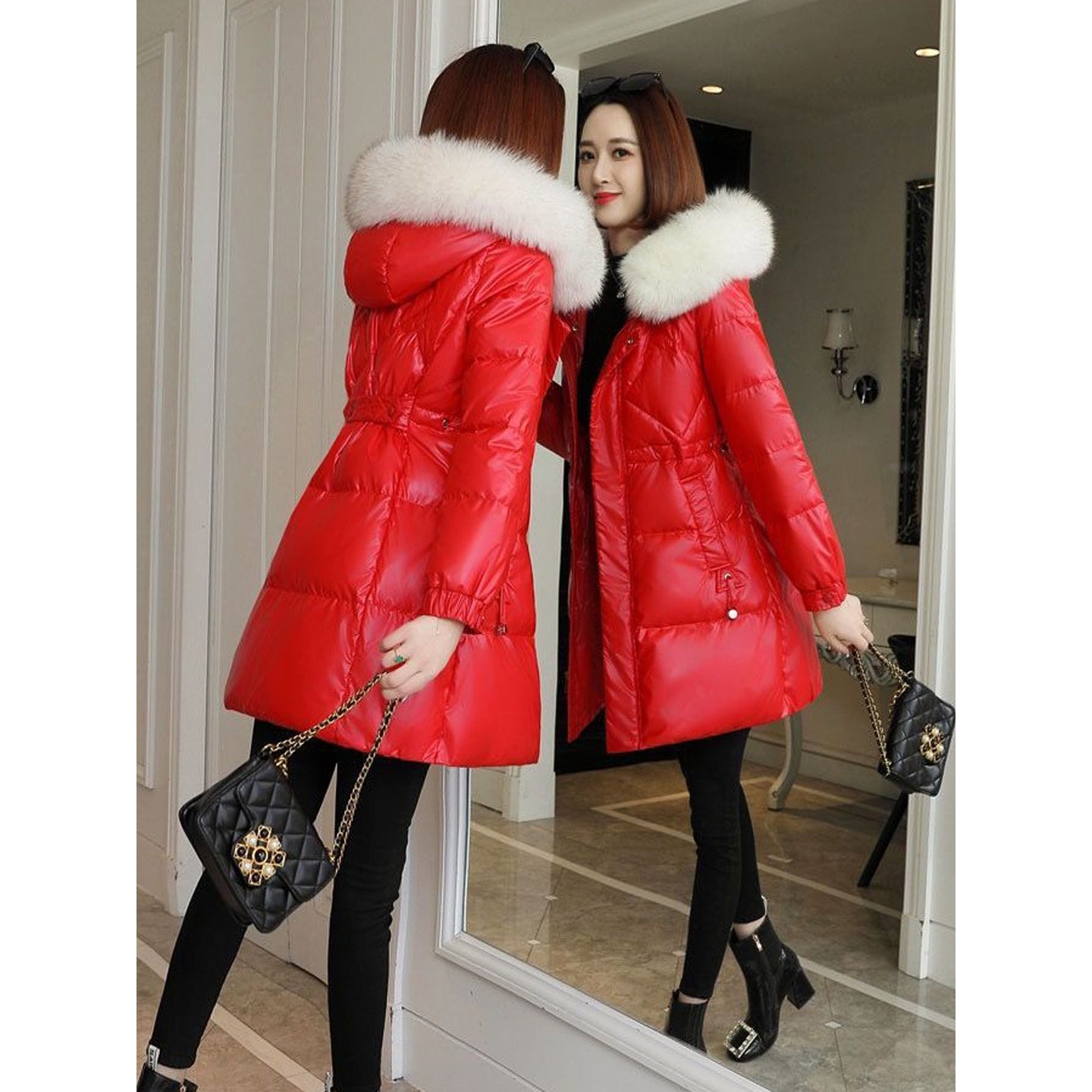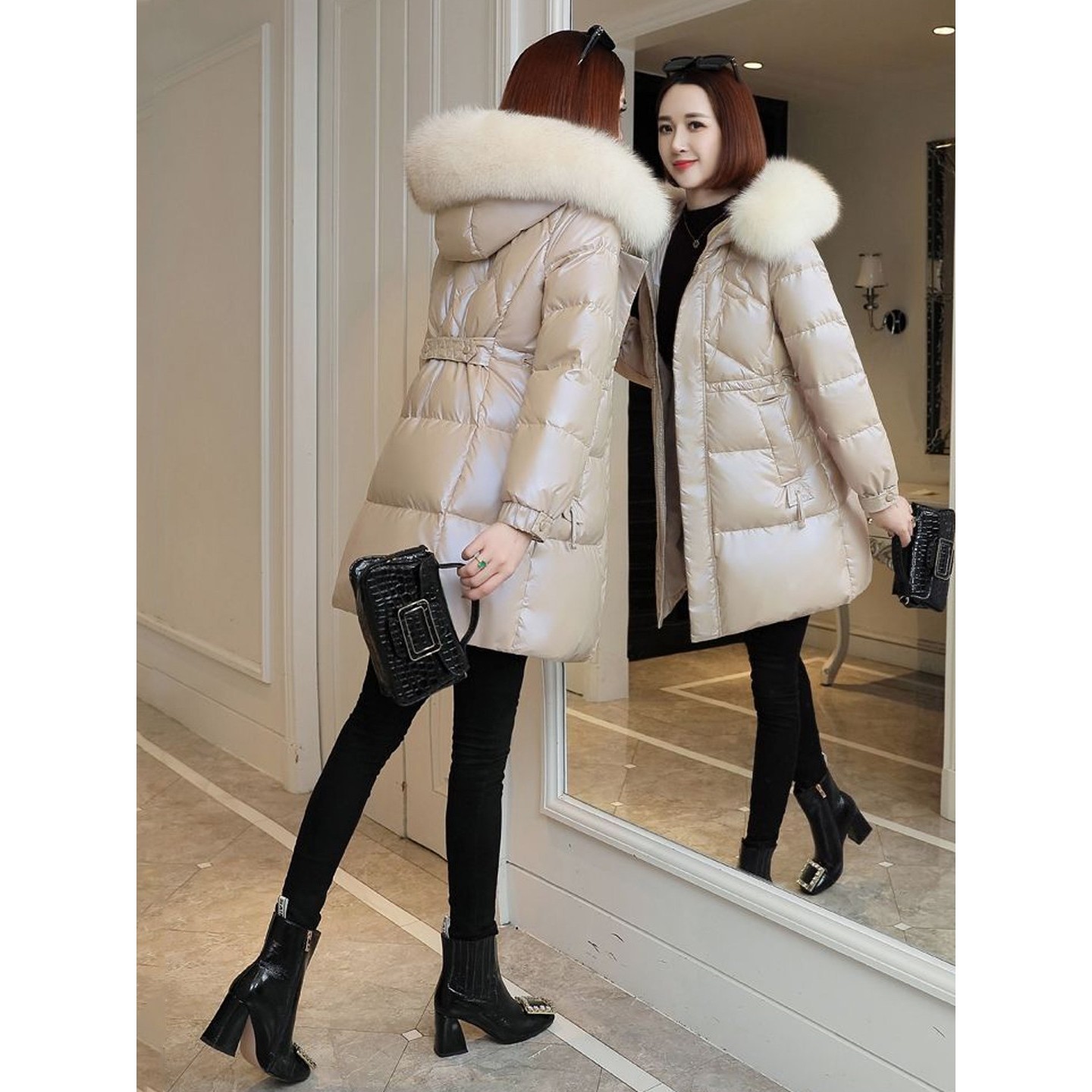 凯乐石薄荷黑色羽绒棉服女中长款修身棉衣2025新款收腰遮屁股洋气