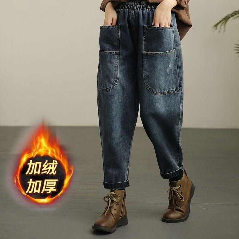 秋冬加绒紧腰牛仔长裤哈伦老爹裤胖MM垮裤复古做旧高腰休闲大码裤