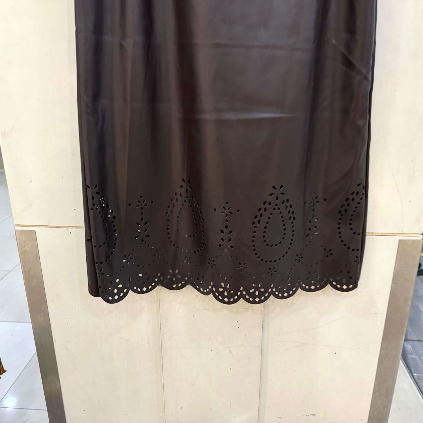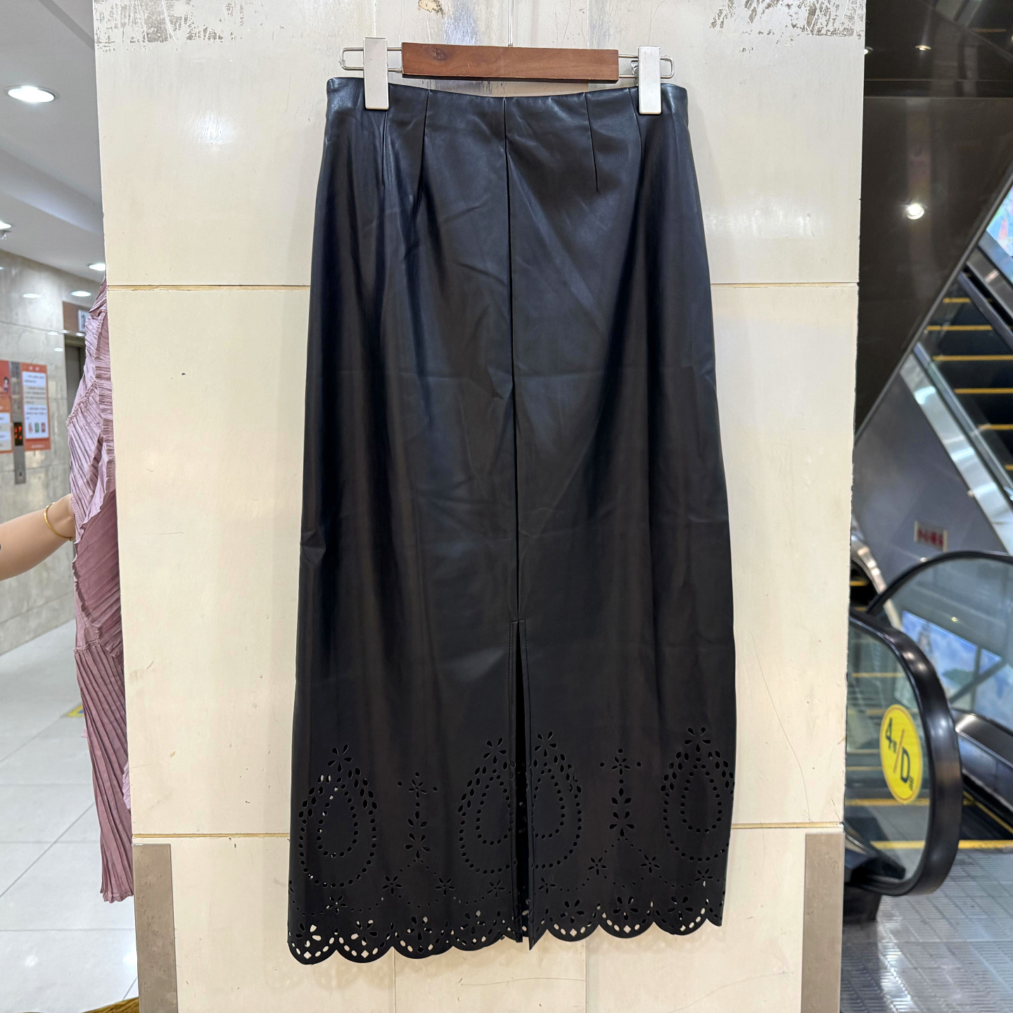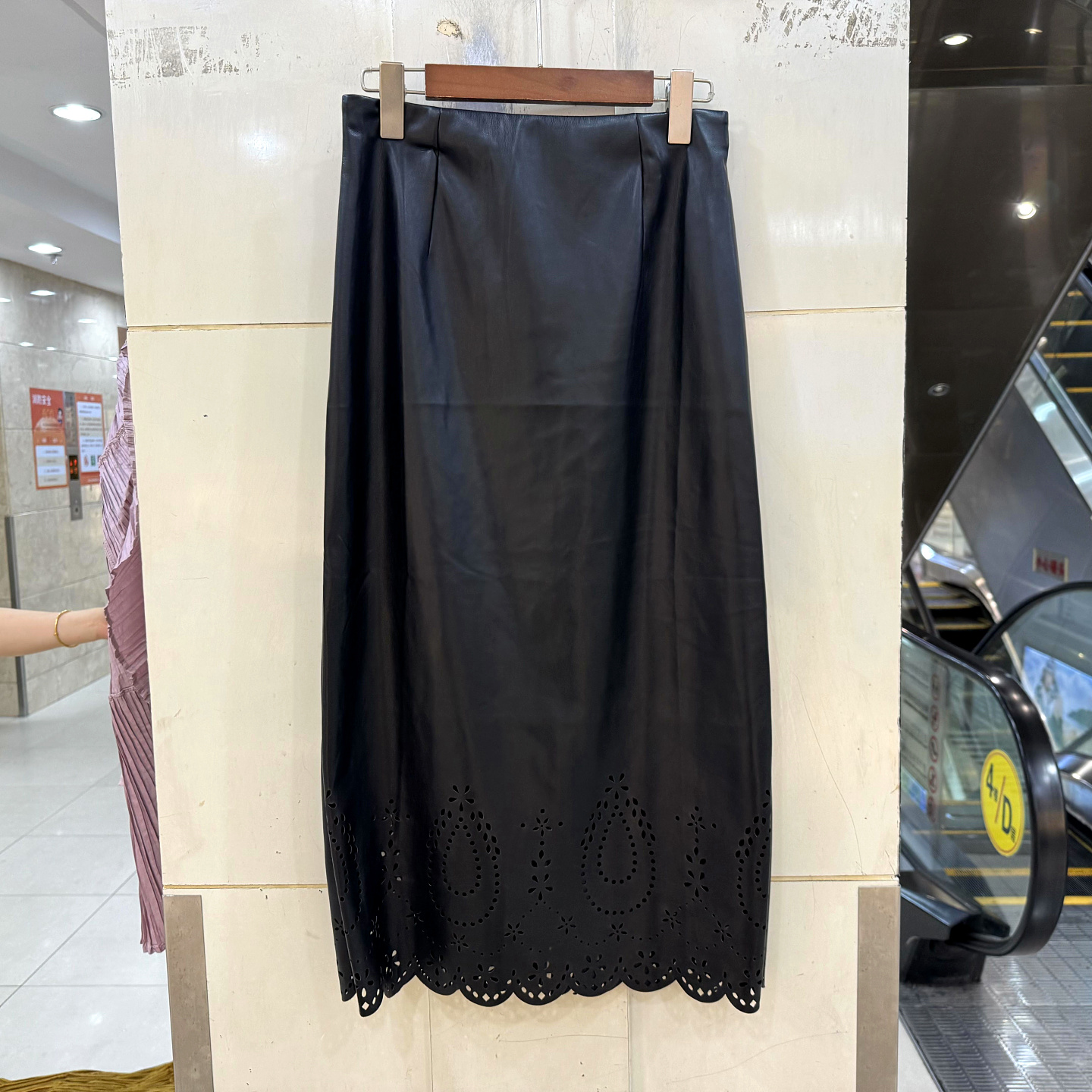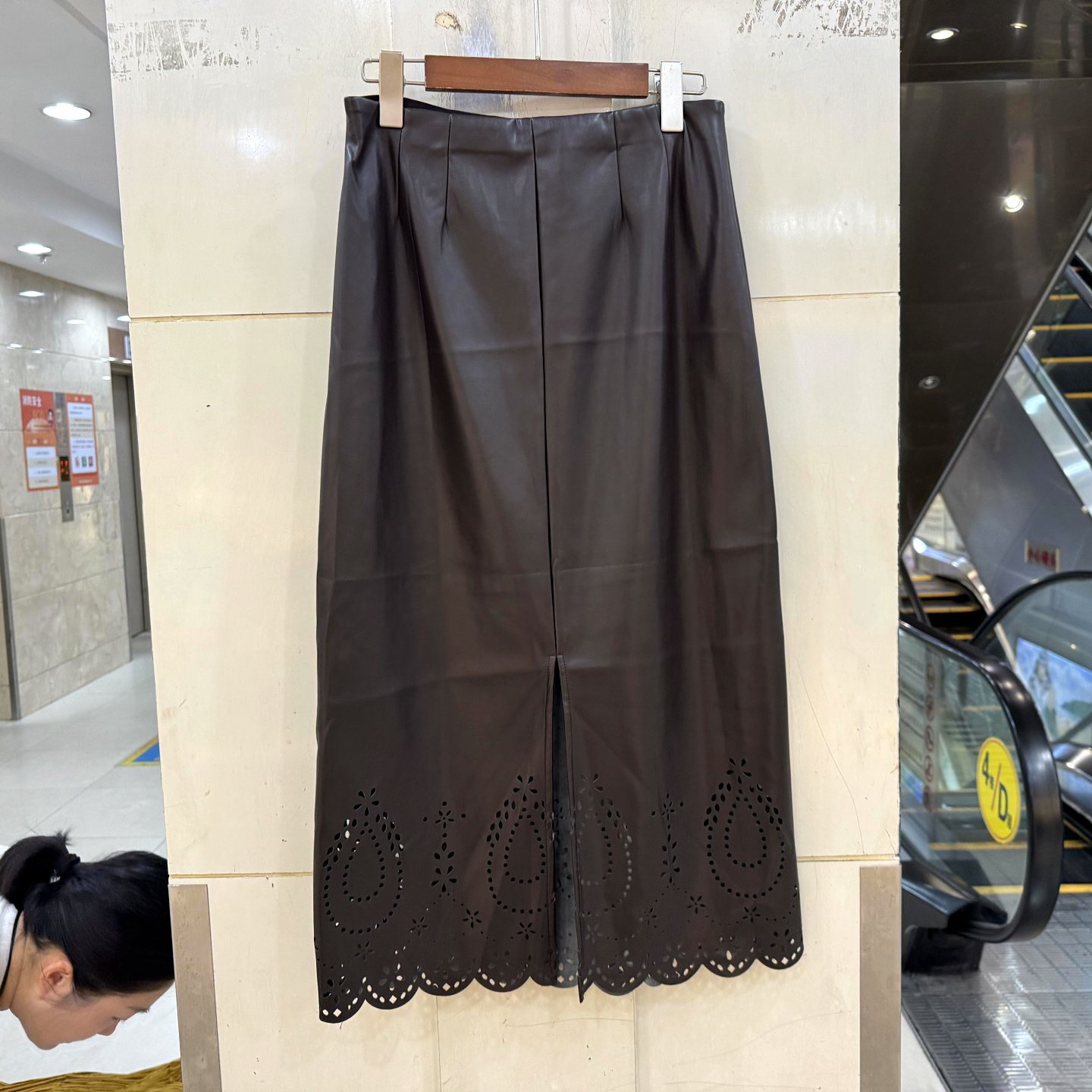 艾妮莉835036 镂空烧花裙摆松紧高腰后开叉PU皮包臀半身裙皮裙秋
