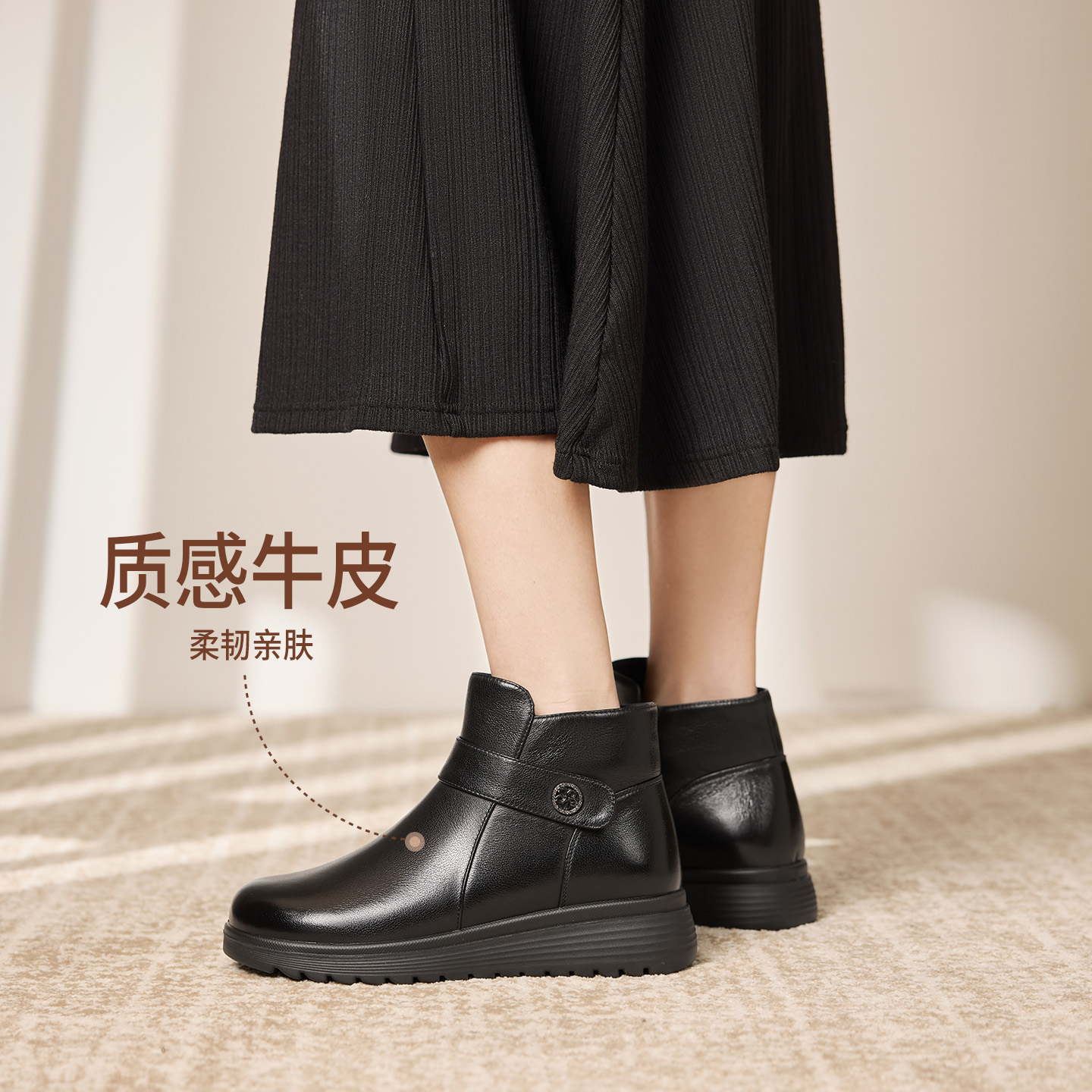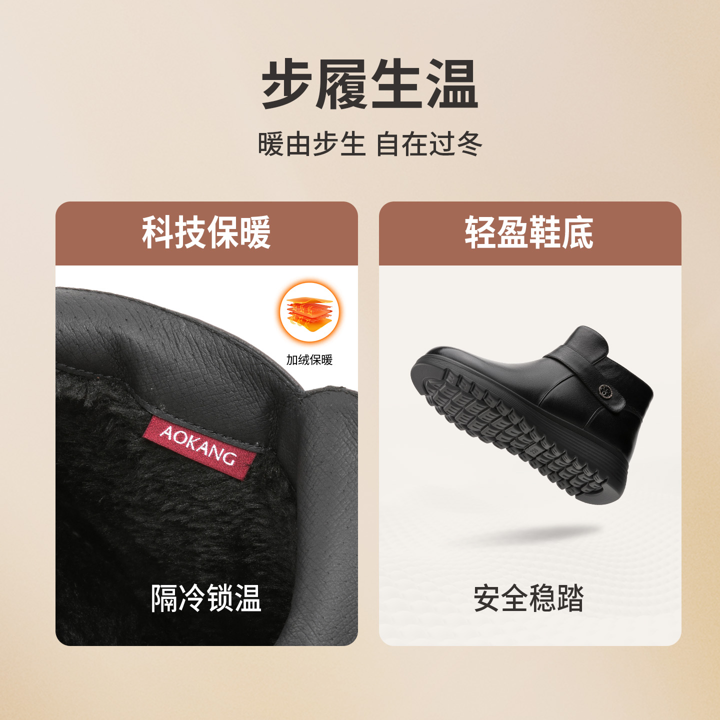 奥康 女鞋2025冬季时装靴真皮加绒黑科技双重保暖妈妈靴百搭短靴