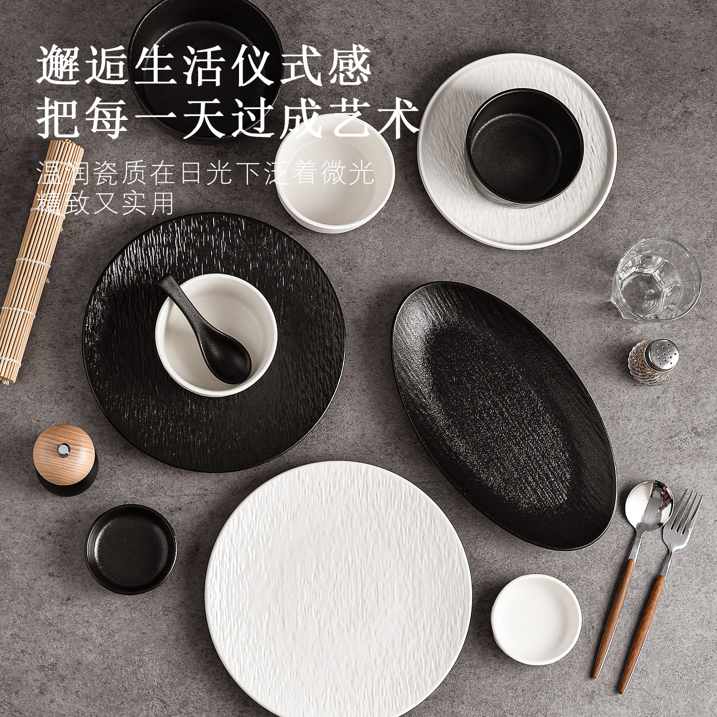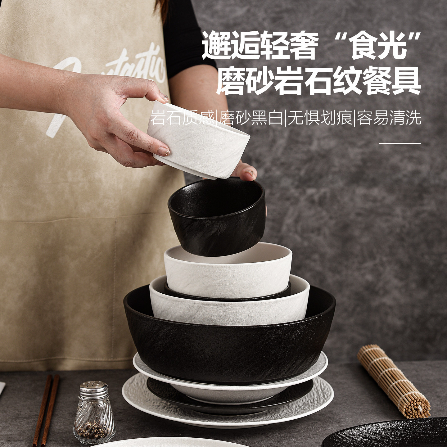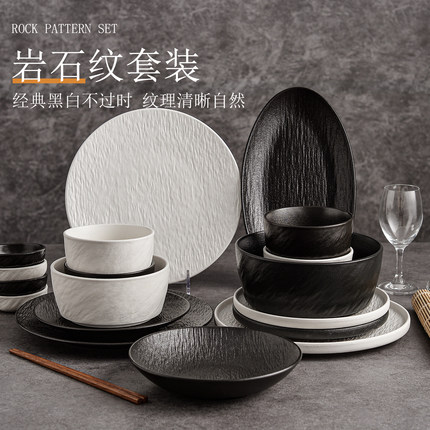 简约碗盘轻奢盘子碗家用日式碗筷陶瓷高级感石纹黑白乔迁餐具套装