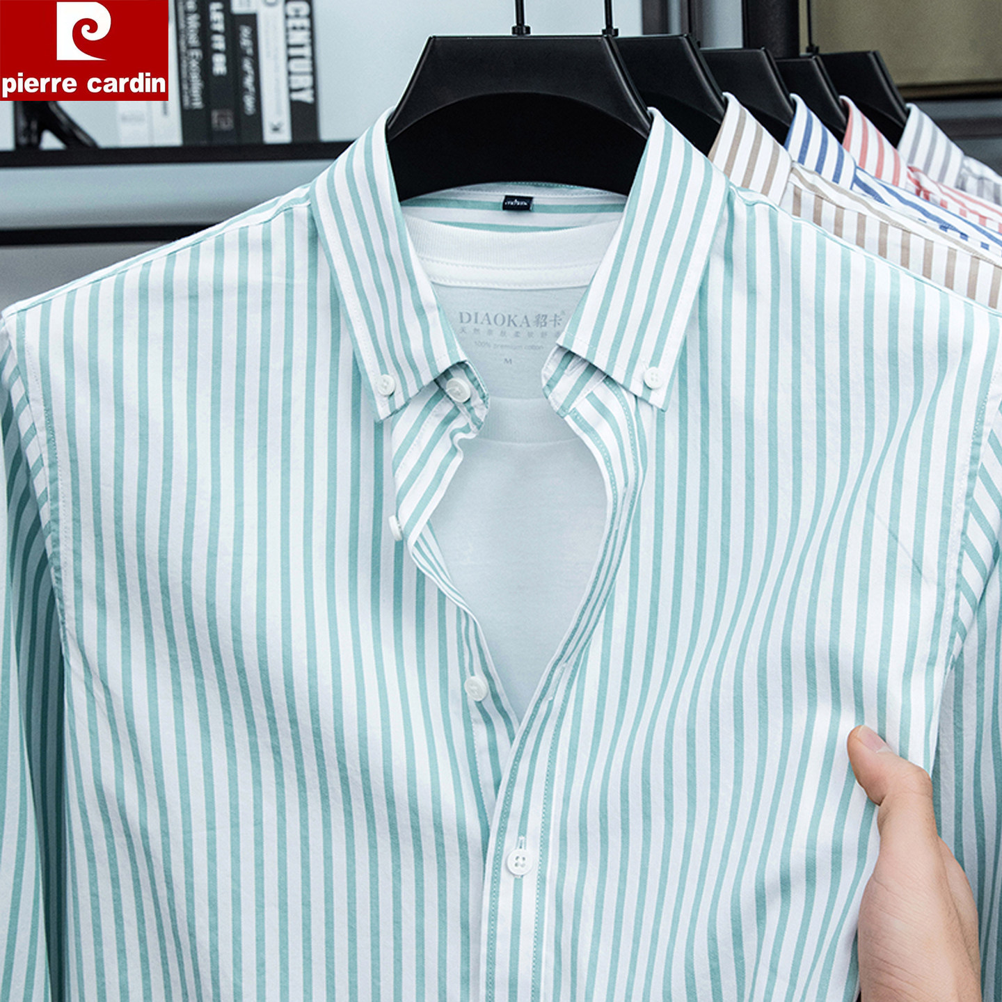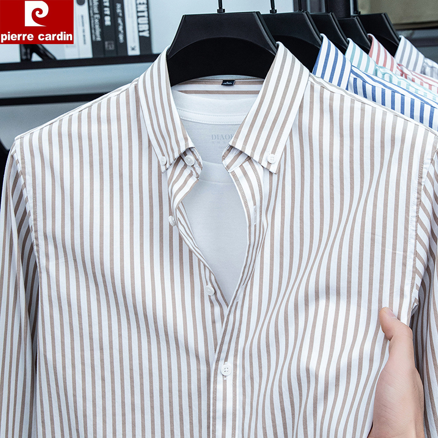 皮尔卡丹莱赛尔棉男士条纹衬衫长袖扣领尖领百搭上衣免烫抗皱衬衣