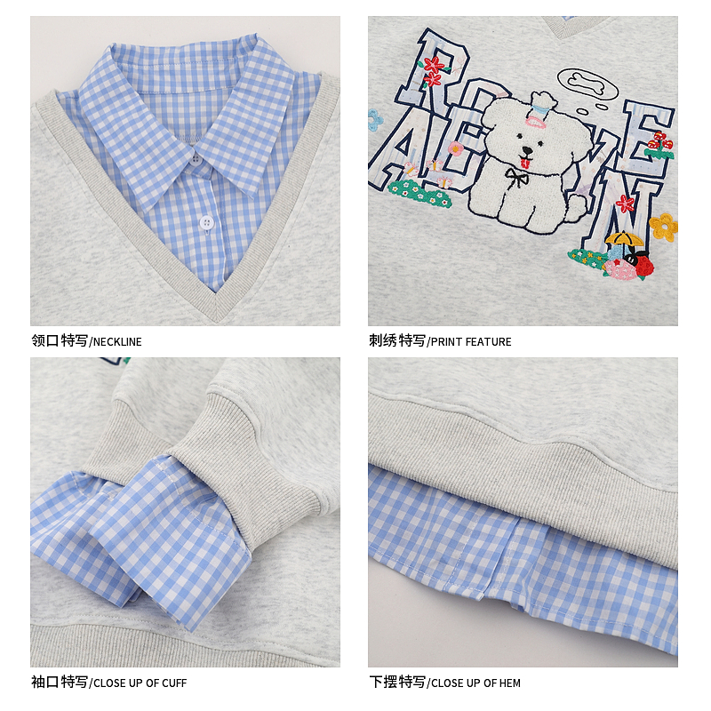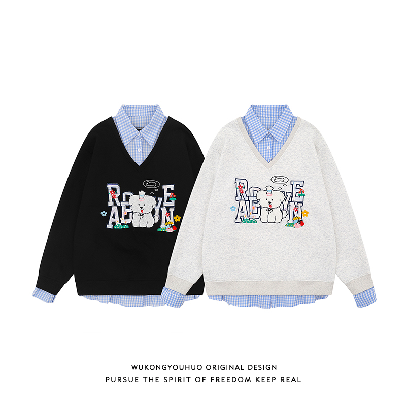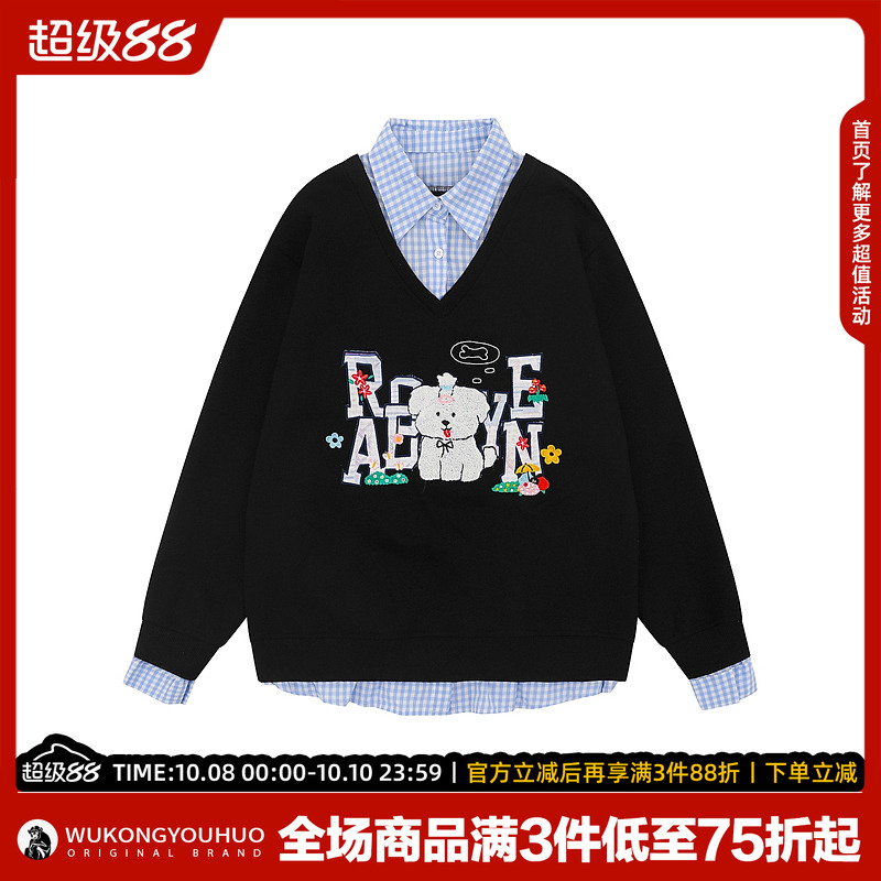 悟空有货美式复古刺绣格子假两件POLO领卫衣男女宽松情侣休闲上衣