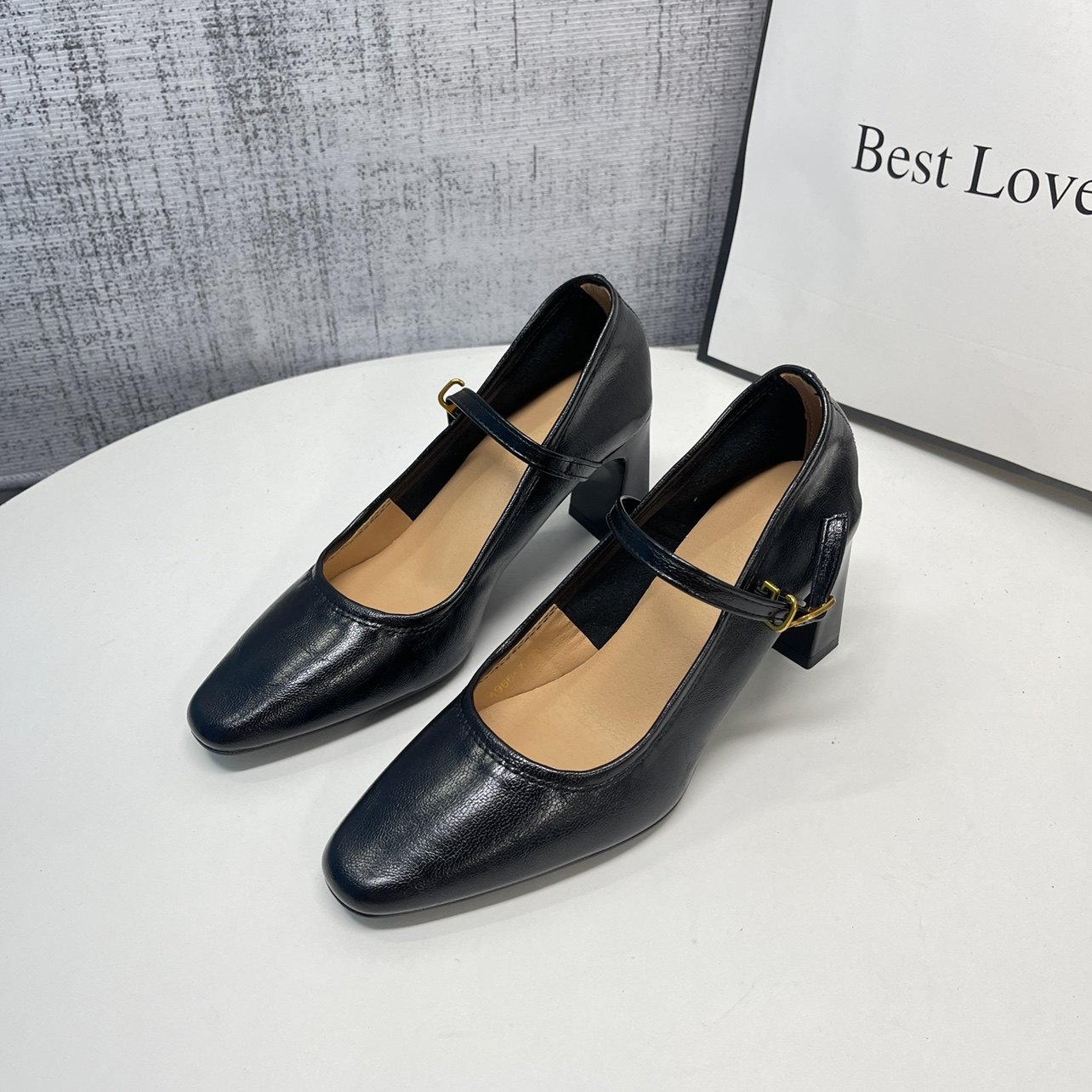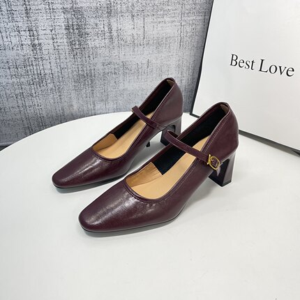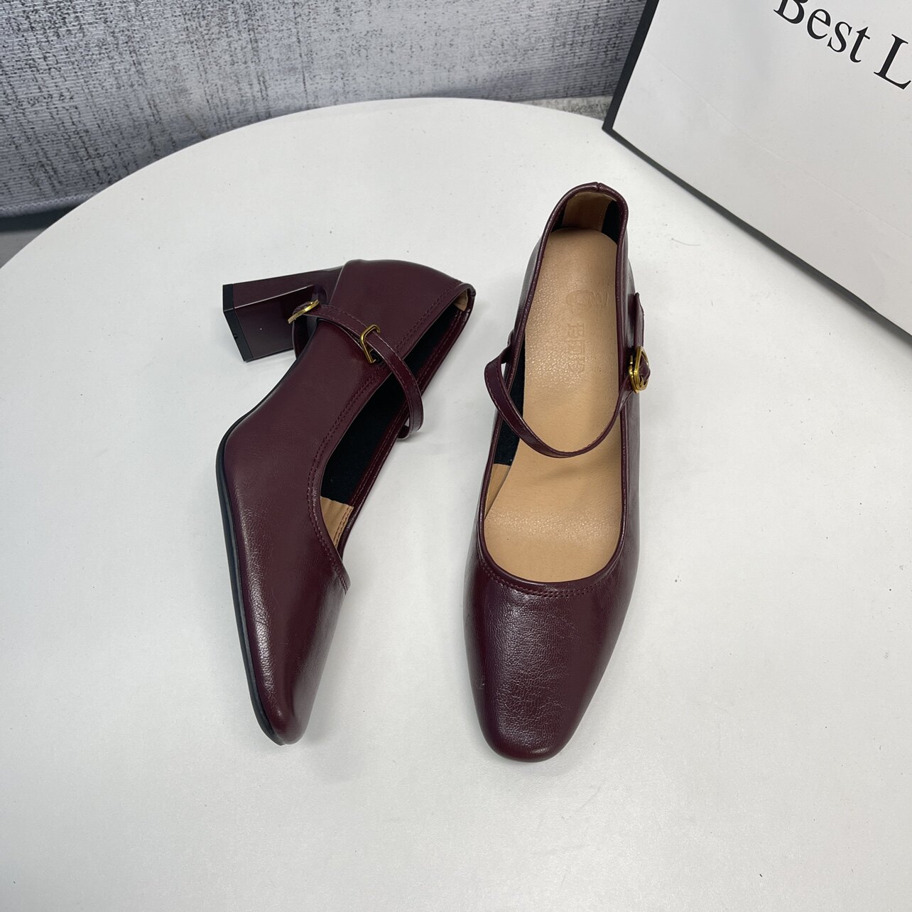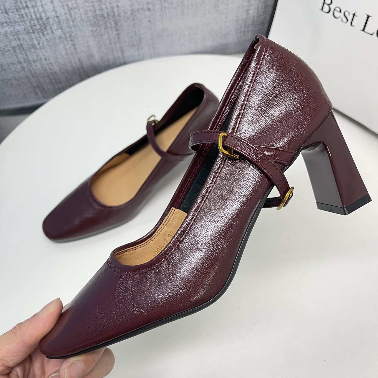 7cm法式复古风方头一字带玛丽珍鞋女百搭粗跟高跟单鞋红色小码33
