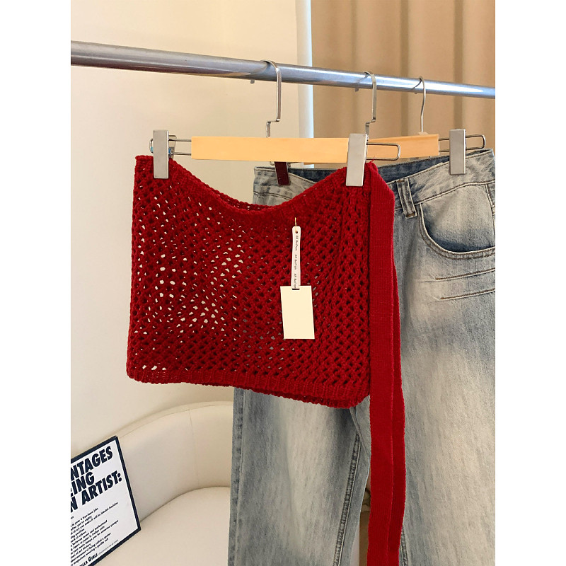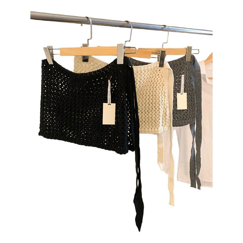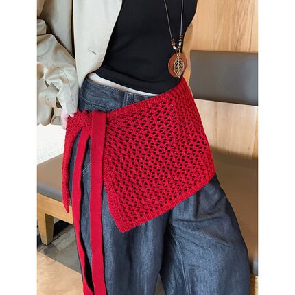 大码胖mm韩系ins红色针织屁帘女秋冬绑带系腰半身裙叠穿镂空裙帘