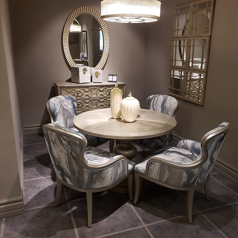 现货美式莫里印象圆餐桌椅组合轻奢实木圆餐桌高端现代雕花拼花面