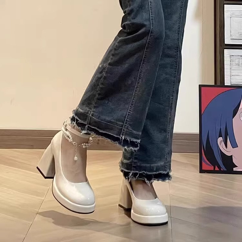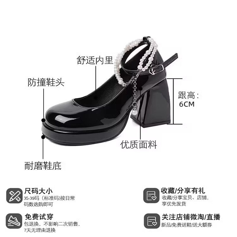 法式珍珠仙女风伴娘鞋玛丽珍鞋子防水台高跟鞋女一字扣带粗跟单鞋