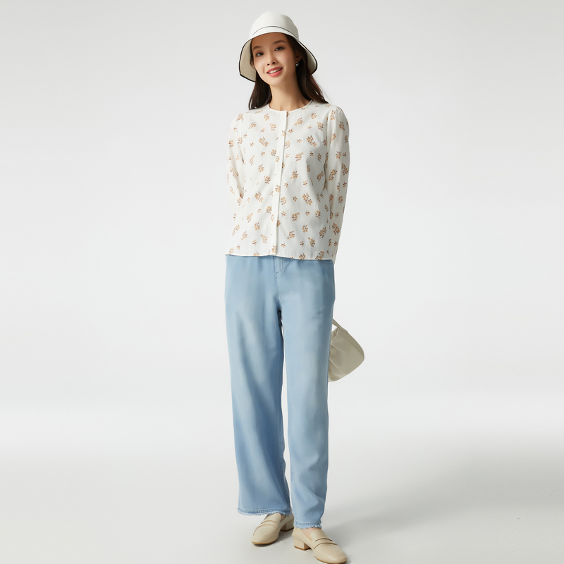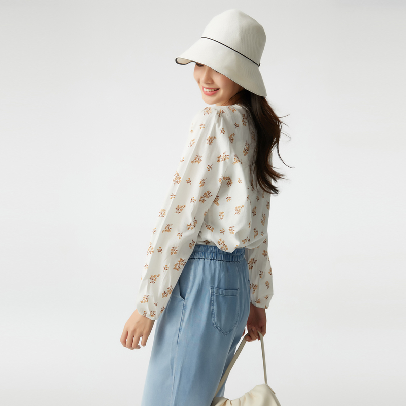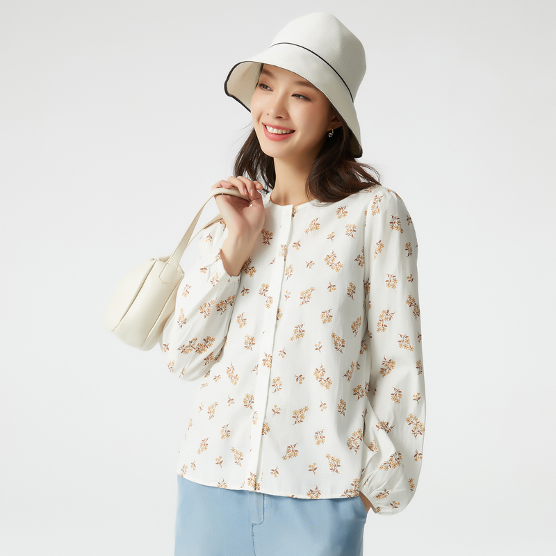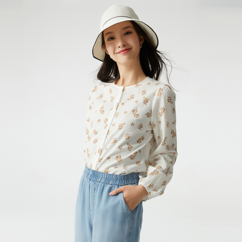 布景衬衫女春夏新品文艺碎花宽松圆领纯棉舒适上衣长袖衬衣3911