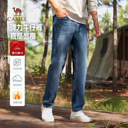 骆驼男装莱卡弹力牛仔裤男款直筒2025秋冬抑菌休闲加绒长裤子