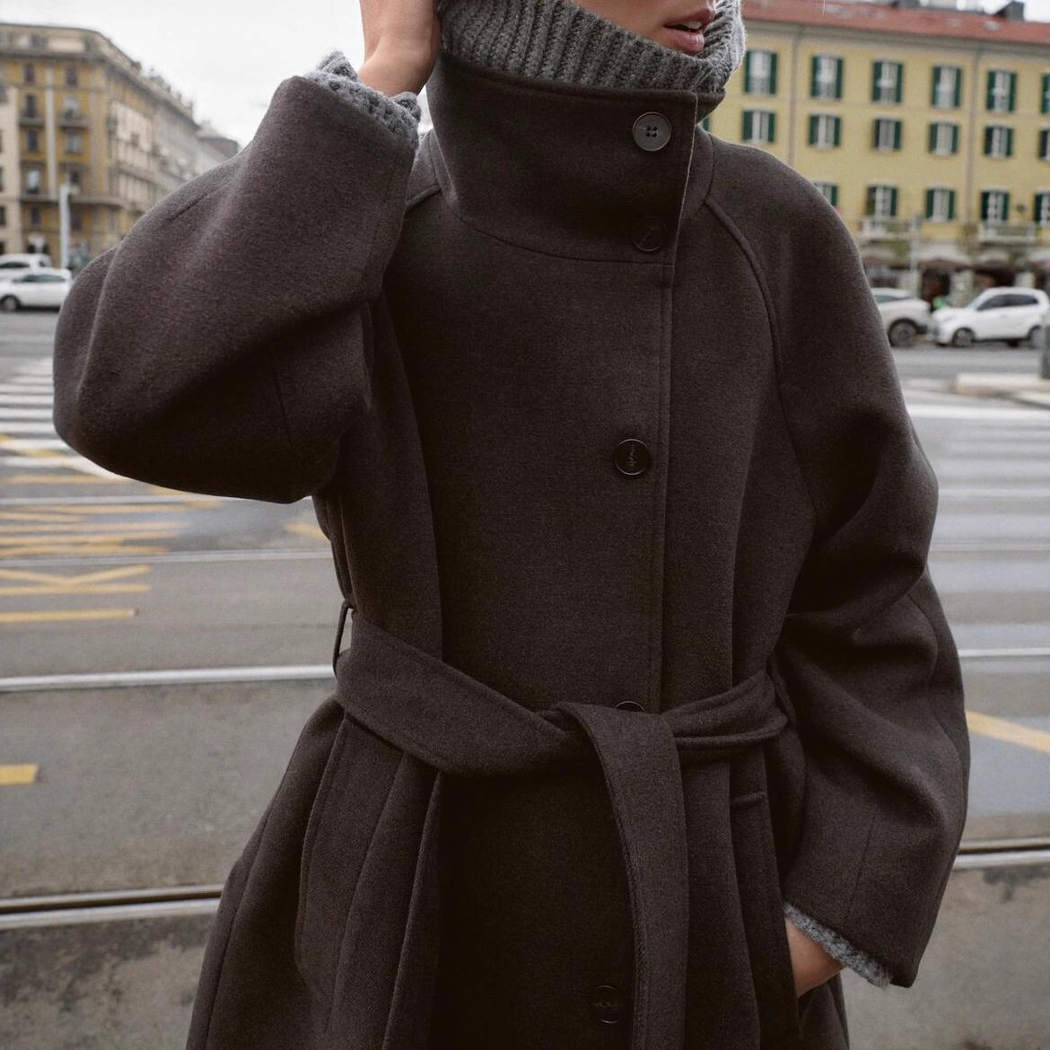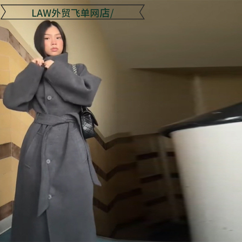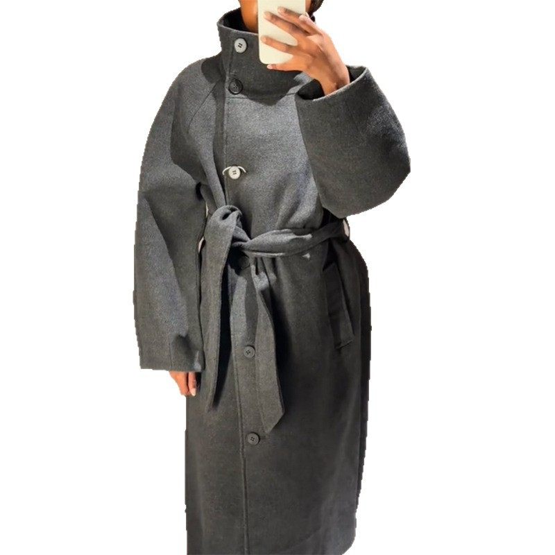 Women's Casual Leather Jacket Coat立领系带大衣纯色简约收腰呢