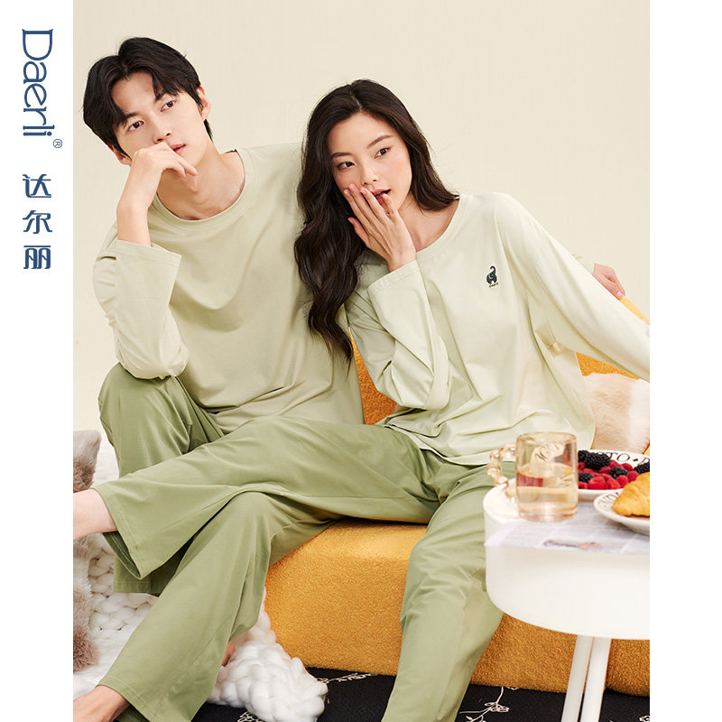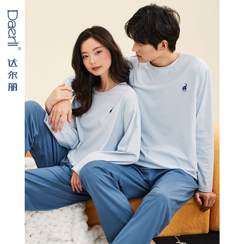 达尔丽春夏情侣睡衣女士纯棉长袖薄款休闲圆领男士家居服春秋套装