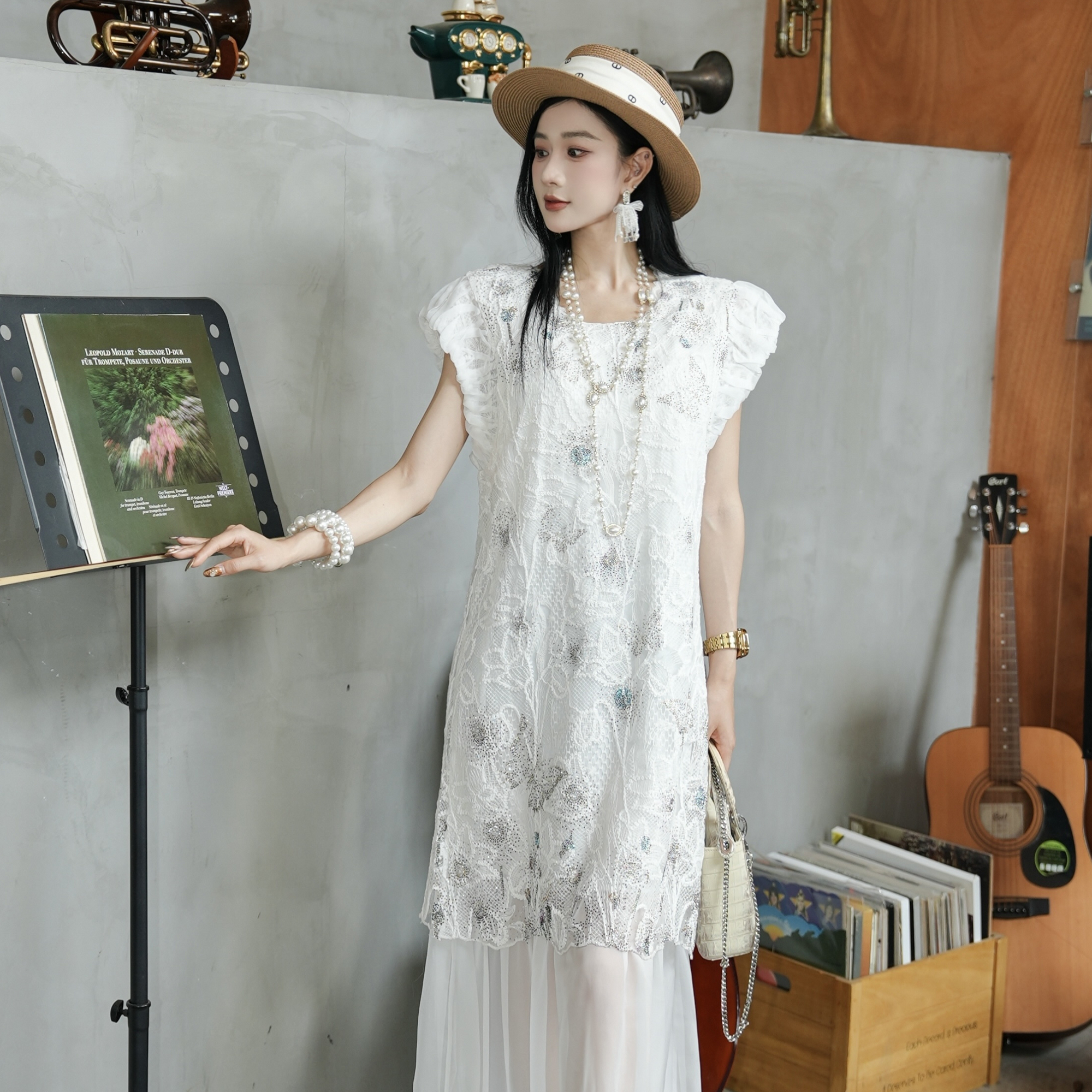TCH私服重工烫钻设计感蕾丝钩花显瘦无袖气质连衣裙女T75B30E5156