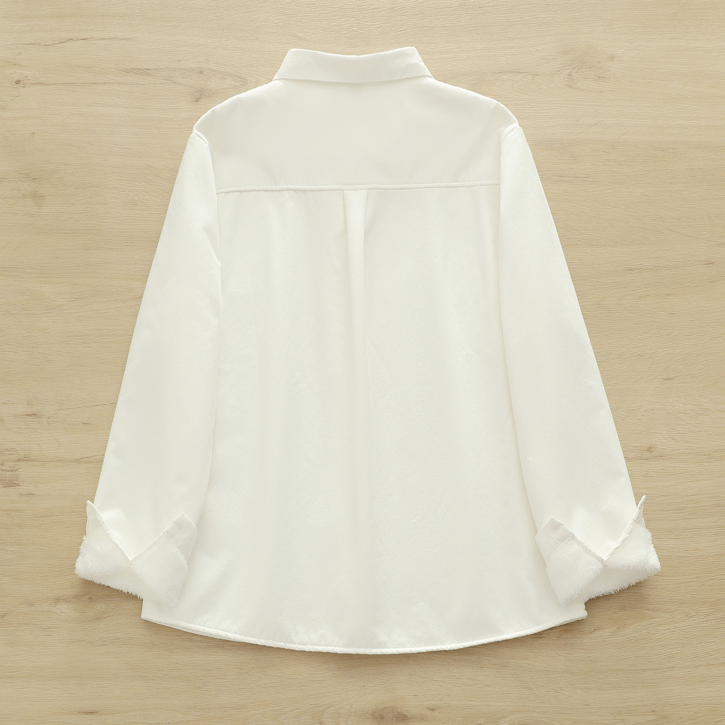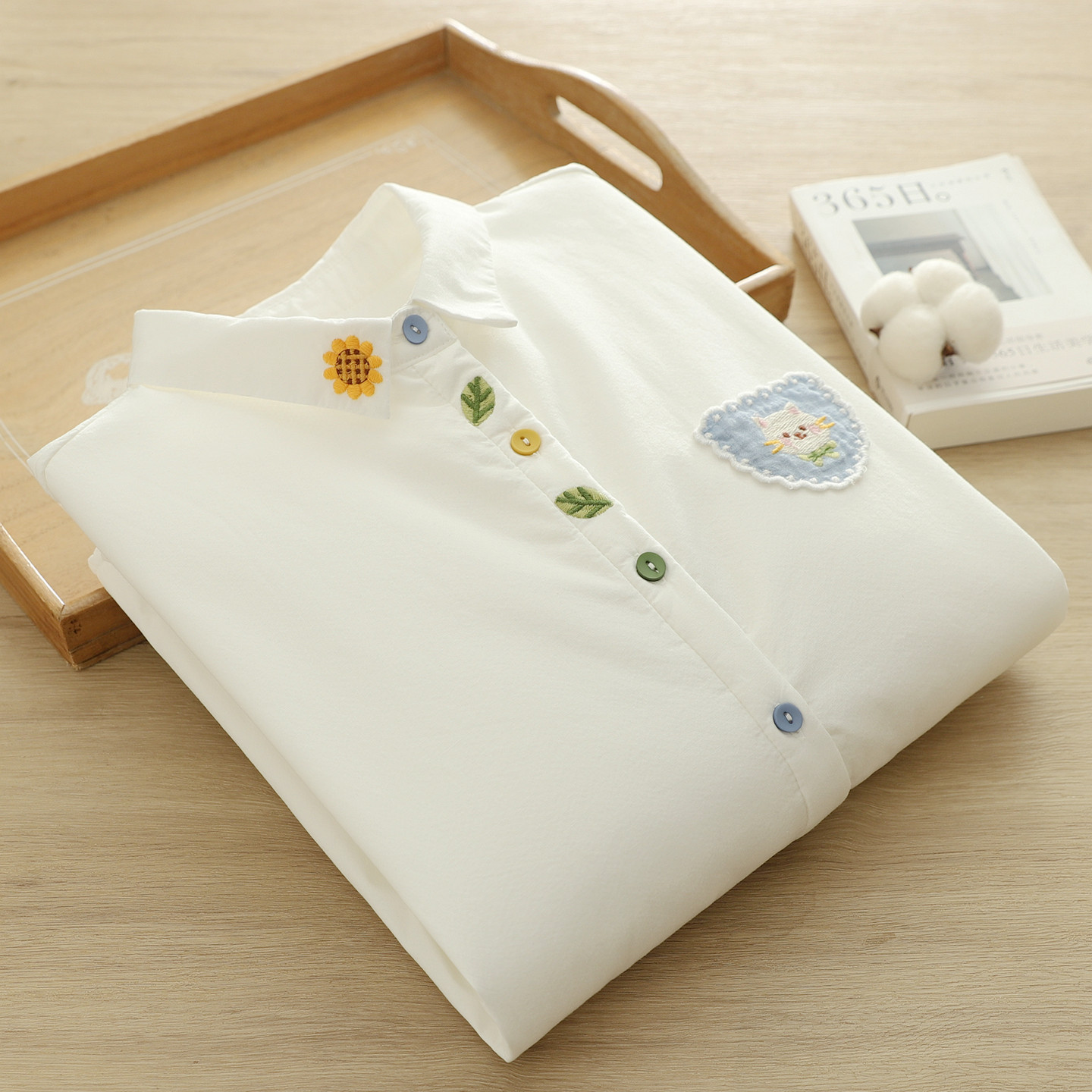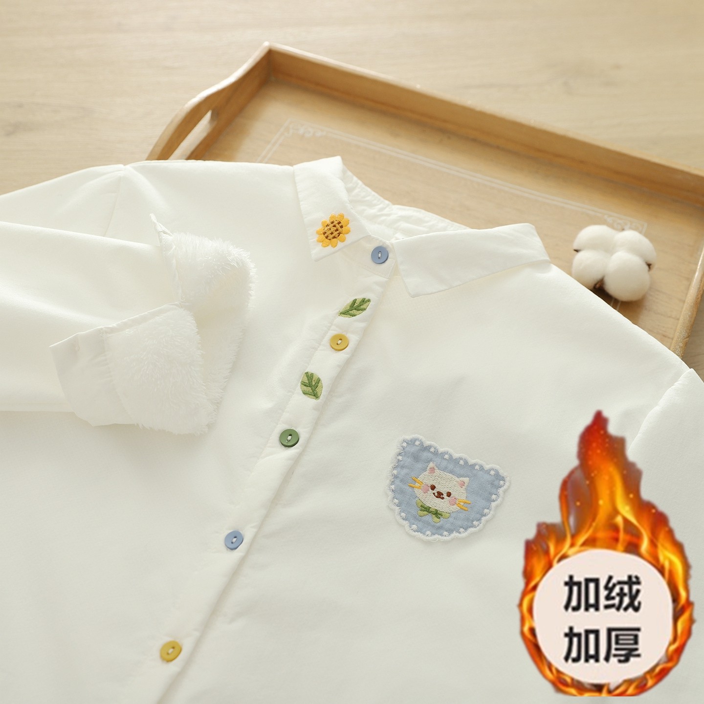 2025冬季文艺小清新刺绣向日葵猫咪纯棉加绒加厚白衬衫女长袖学生