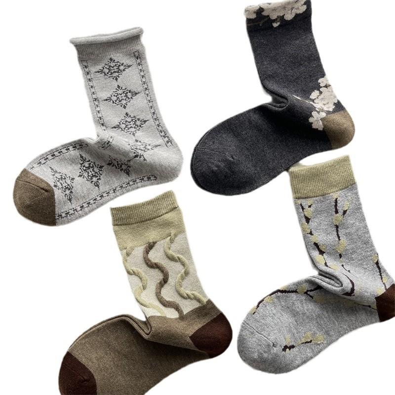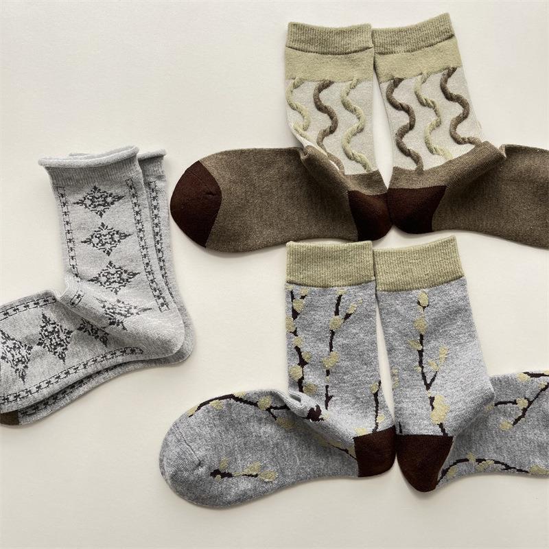 秋冬宫廷风花朵羊毛中筒袜日系复古卷边菱形堆堆袜立体线条袜子女