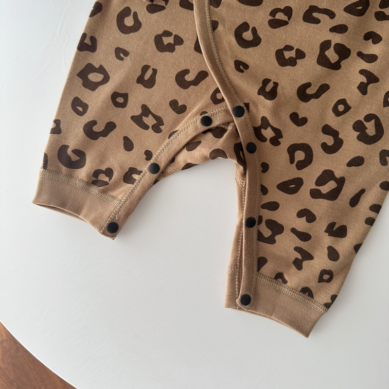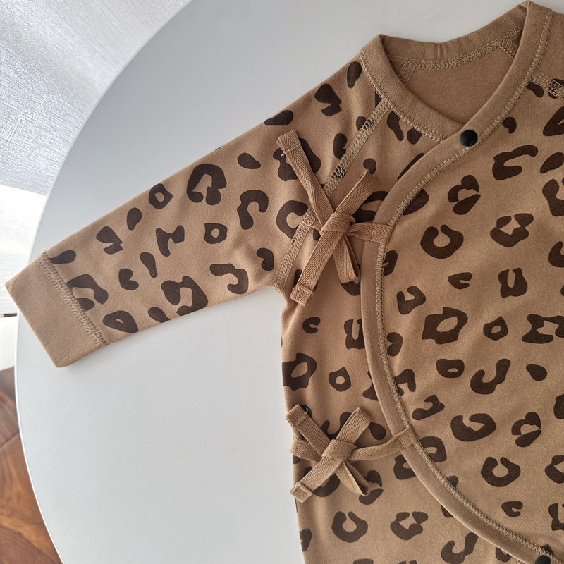 Roubaby新生婴儿男女宝宝春秋冬连体衣纯棉豹纹爬服系带款家居服