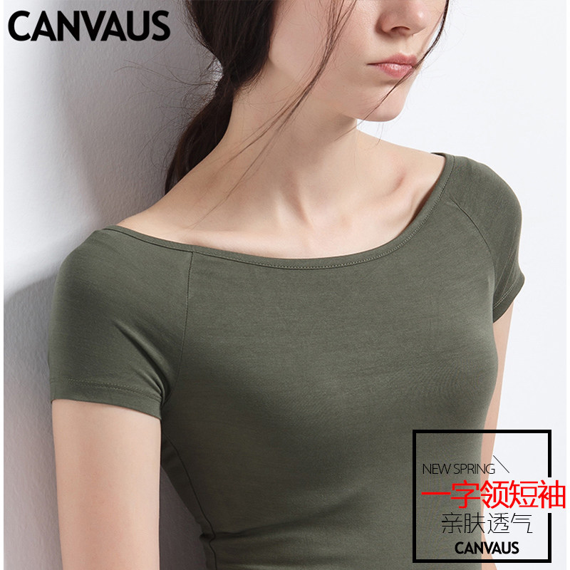 一字领夏季莫代尔短袖t恤女修身纯色体桖打底衫紧身短款显瘦上衣
