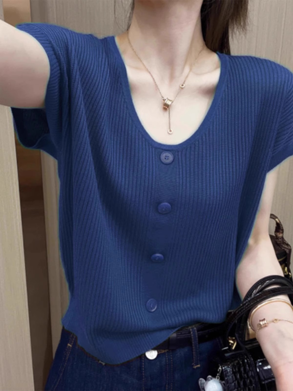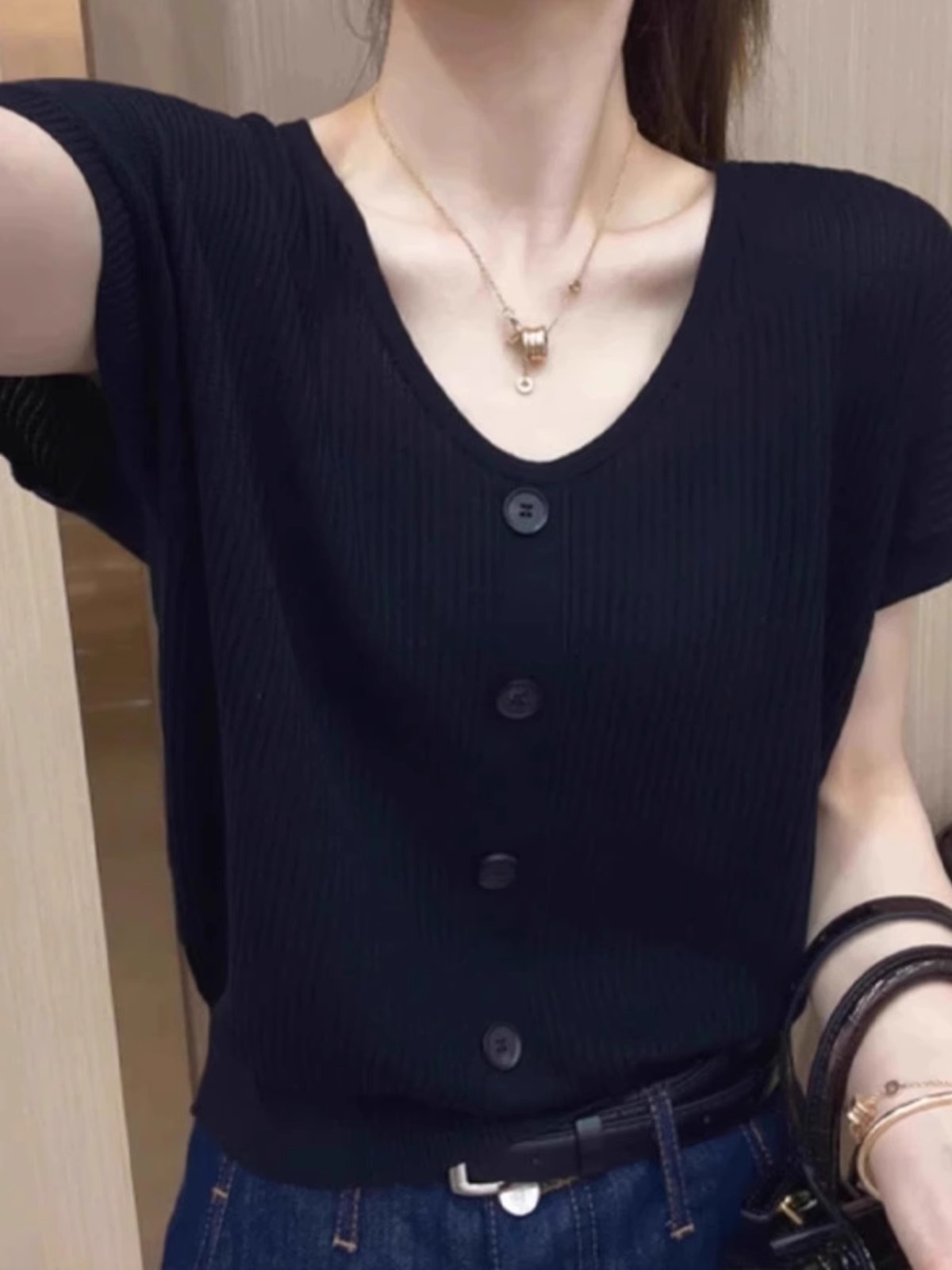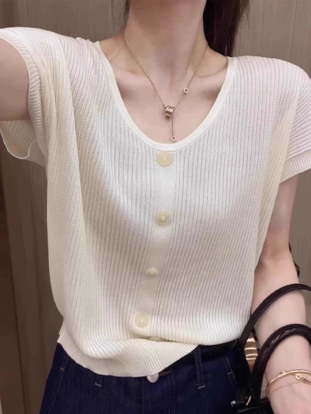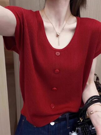 复古红欧货U领短袖针织衫女冰丝上衣洋气2025春夏新款轻熟风打底