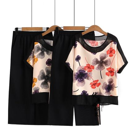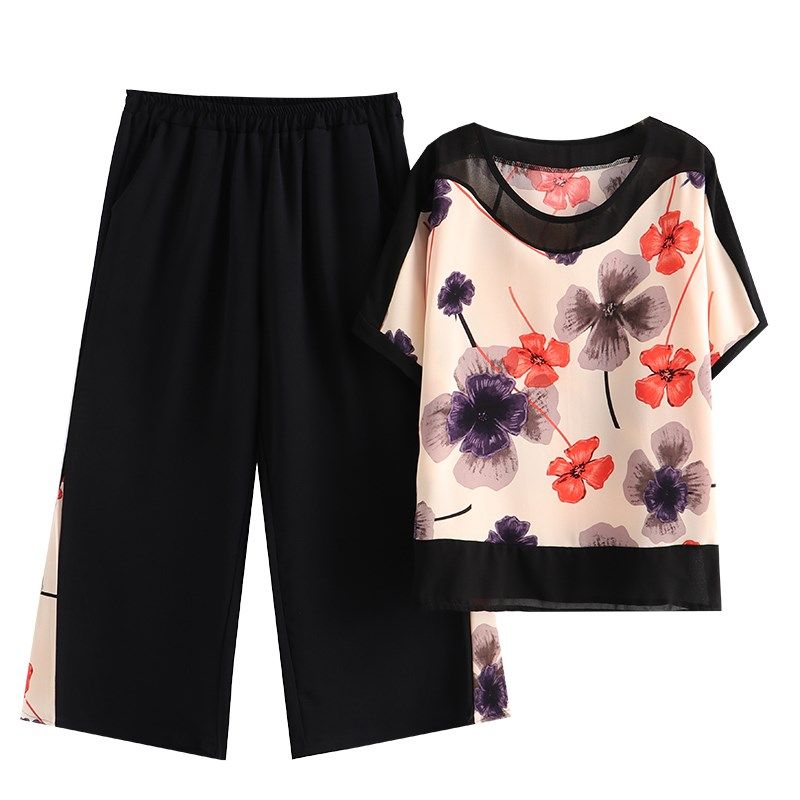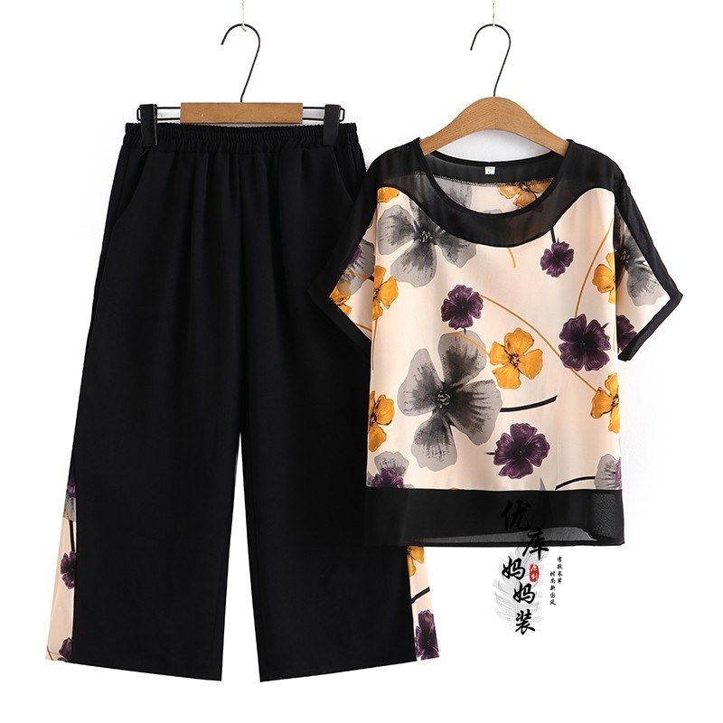 中老年妈妈款雪纺短袖T恤衫套装夏季洋气九分裤老人女士婆婆上衣