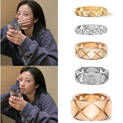 coco菱格纹戒指轻奢18k金镶钻叠戴宽窄版小香风925银情侣对戒指环